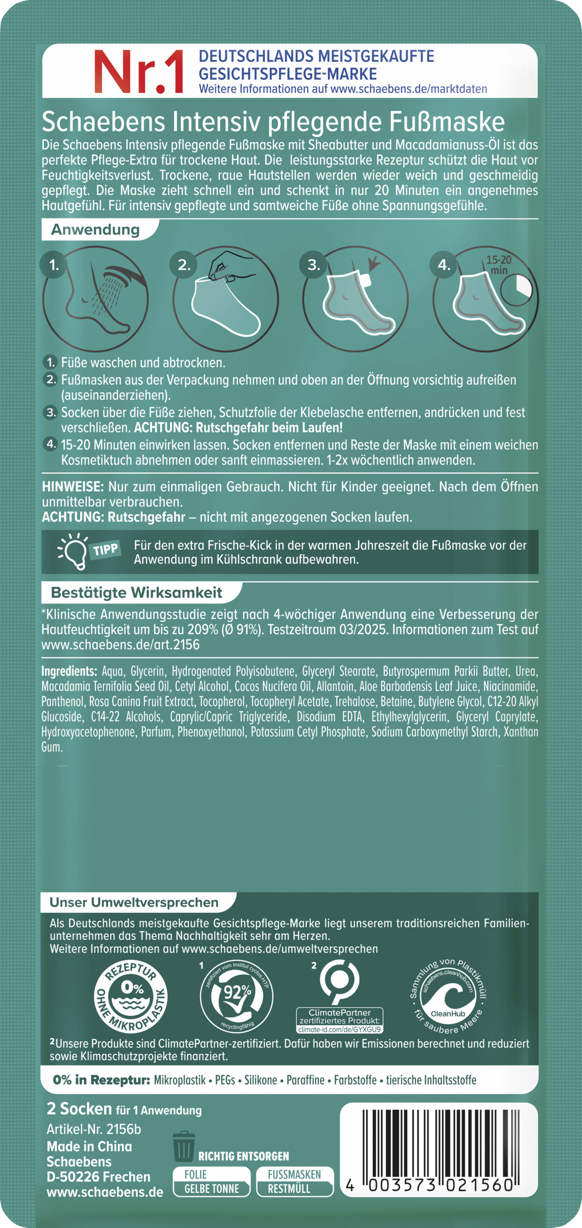 Schaebens intensivt nærende fodmaske med Sheasmør , macadamianøddeolie og urinstof er den perfekte Extra Pleje til tør hud. Den ikke-fedtede Formel giver op til 227 %* mere fugt og beskytter mod Fugttab. Tørre, ru hudområder plejes bløde og smidige. Masken absorberes hurtigt og efterlader huden behagelig på kun 20 minutter. Til intensivt plejede og fløjlsbløde fødder uden spændingsfølelse.