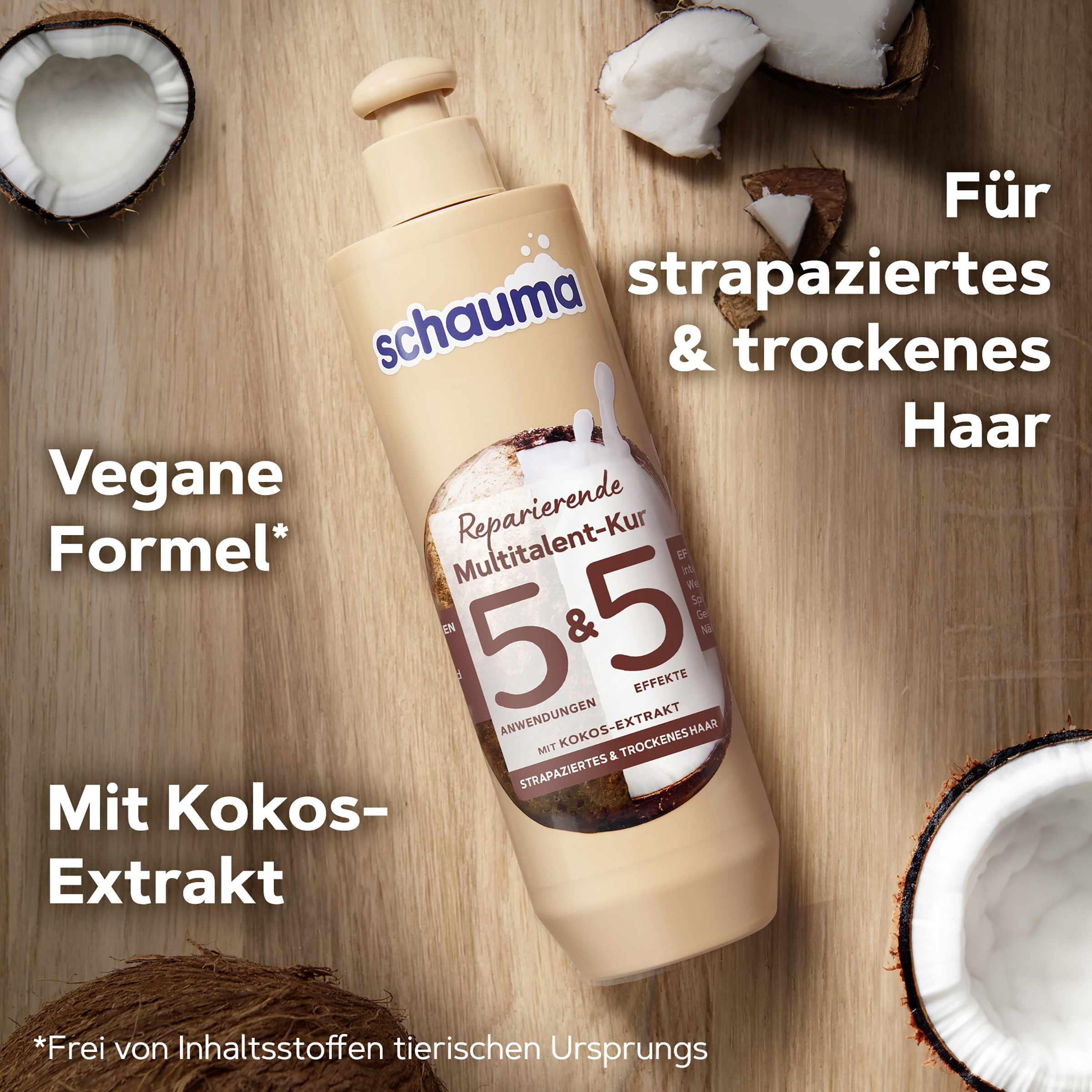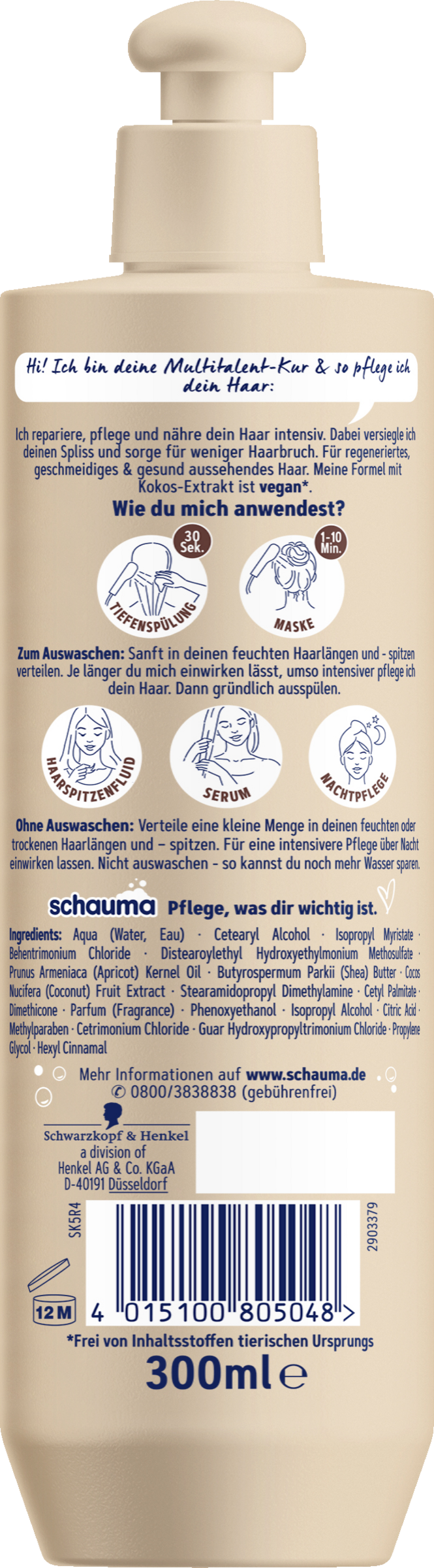5 forskellige applikationer, 5 effekter til dit hår! Den lette formel tilpasser sig dine behov og din tid - døgnet rundt! Den reparerende Hårkur til beskadiget og tørt hår reparerer og nærer dit hår intensivt indefra og ud, mens den forsegler spaltede spidser for at give et smidigt og sundt hår. Resultatet: Hår, der er mindre tilbøjelige til at Hårbrud og ser repareret og sundt ud hele dagen lang! Den veganske formel, med kokosnøddeekstrakt, er velegnet som en dyb balsam og hårmaske til udvaskning eller som hårspidsvæske, leave-in hårserum og plejebehandling natten over.