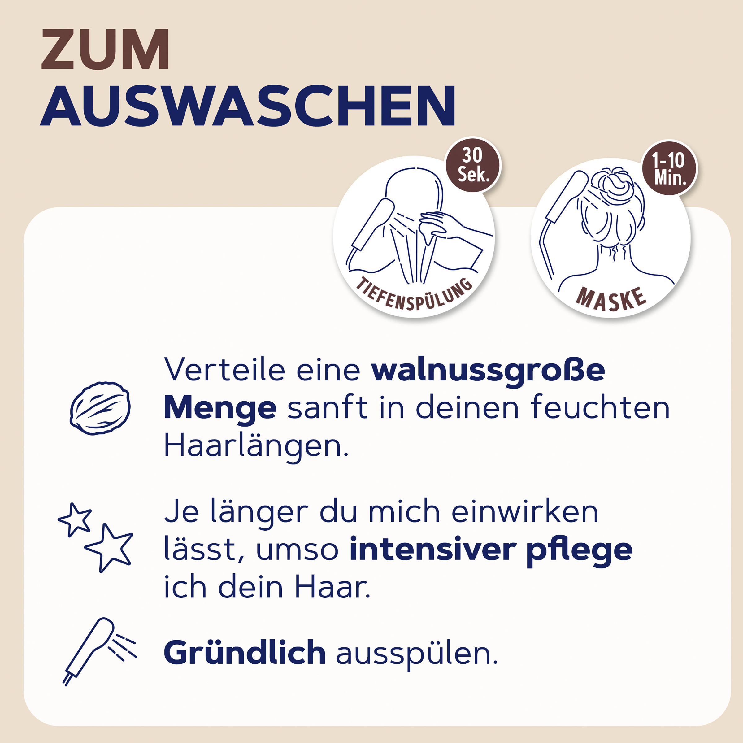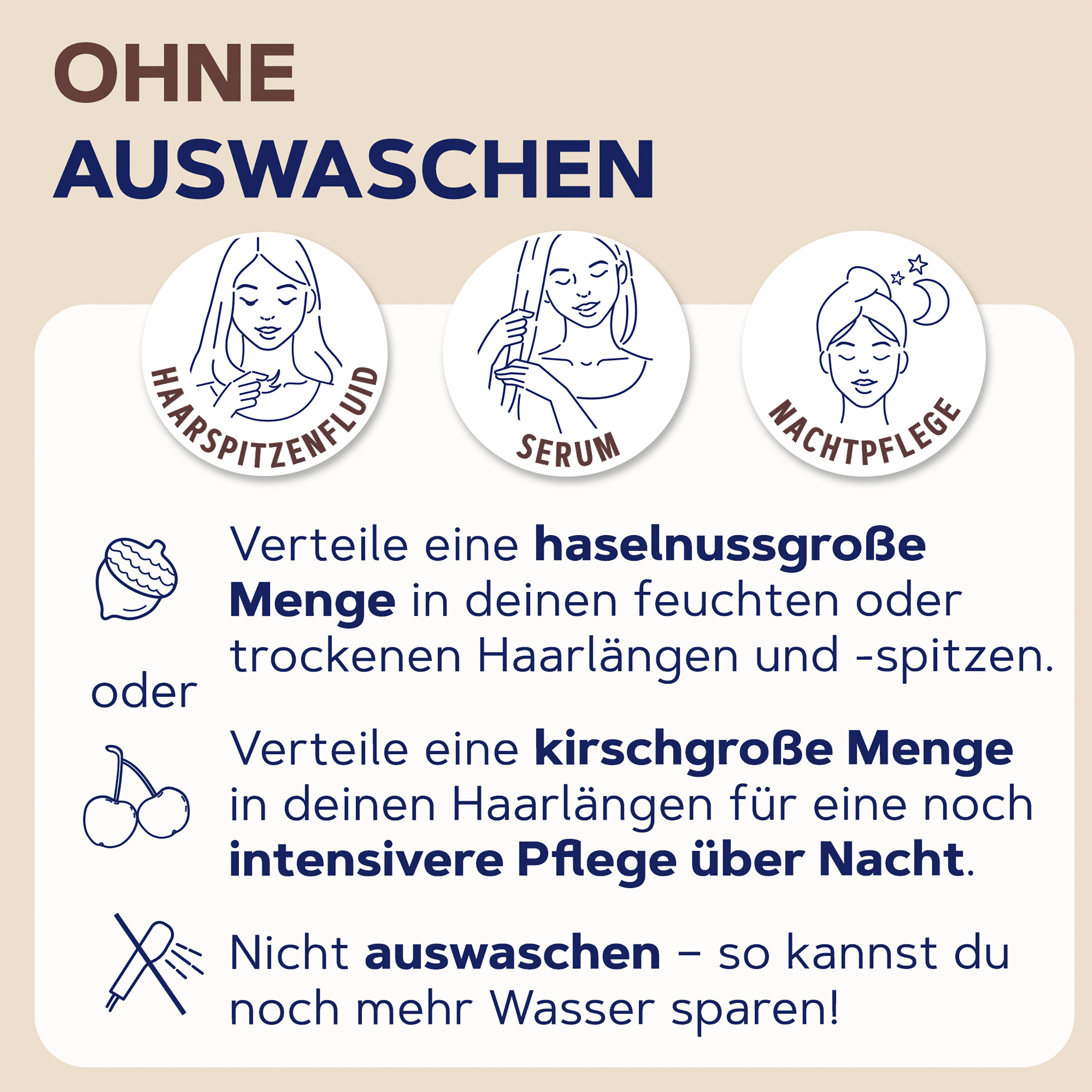 - Uden at vaske ud: Fordel en lille mængde i dine fugtige eller tørre hårlængder og -spidser. For mere intensiv Pleje, lad virke natten over. Vask det ikke ud – på denne måde kan du spare endnu mere vand.