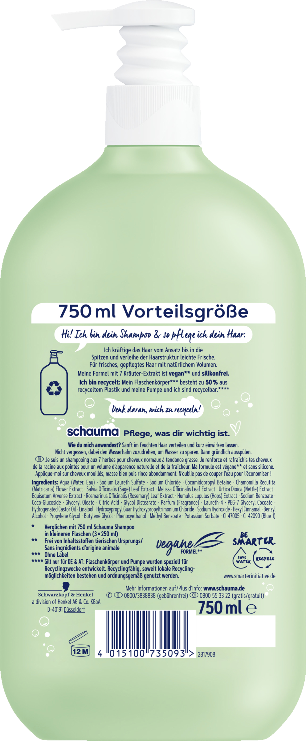 SCHAUMA 7 herbs freshness Shampoo til normalt til hurtigt fedtet hår. Hej! Jeg er din Shampoo og sådan plejer jeg dit hår: Jeg styrker håret fra rod til spids, fjerner overskydende olie og giver hårets struktur en let friskhed. Til friskt, velplejet hår med naturlig volumen. Min formel med 7 urteekstrakt er vegansk* og fri for silikone. Jeg er genbrugt: Min flaskekrop** er lavet af 50 % genbrugsplast og mit låg er lavet af 25 % genbrugsplast. Husk at genbruge mig! For at gøre dette skal du adskille låget fra flaskens krop og smide begge dele i plastikaffaldet.*** Hvordan bruger du mig? Fordel forsigtigt Shampoo i fugtigt hår og lad det virke kortvarigt. Glem ikke at lukke for hanen for at spare på vandet. Skyl derefter dit Hår grundigt. SCHAUMA. Pleje på det, der er vigtigt for dig. Vær klogere. Spar vand. Genbruge. Få mere at vide på www.smarterinitiative.de * Fri for ingredienser af animalsk oprindelse. ** Uden etiket *** Kontroller venligst lokale genbrugsbetingelser.