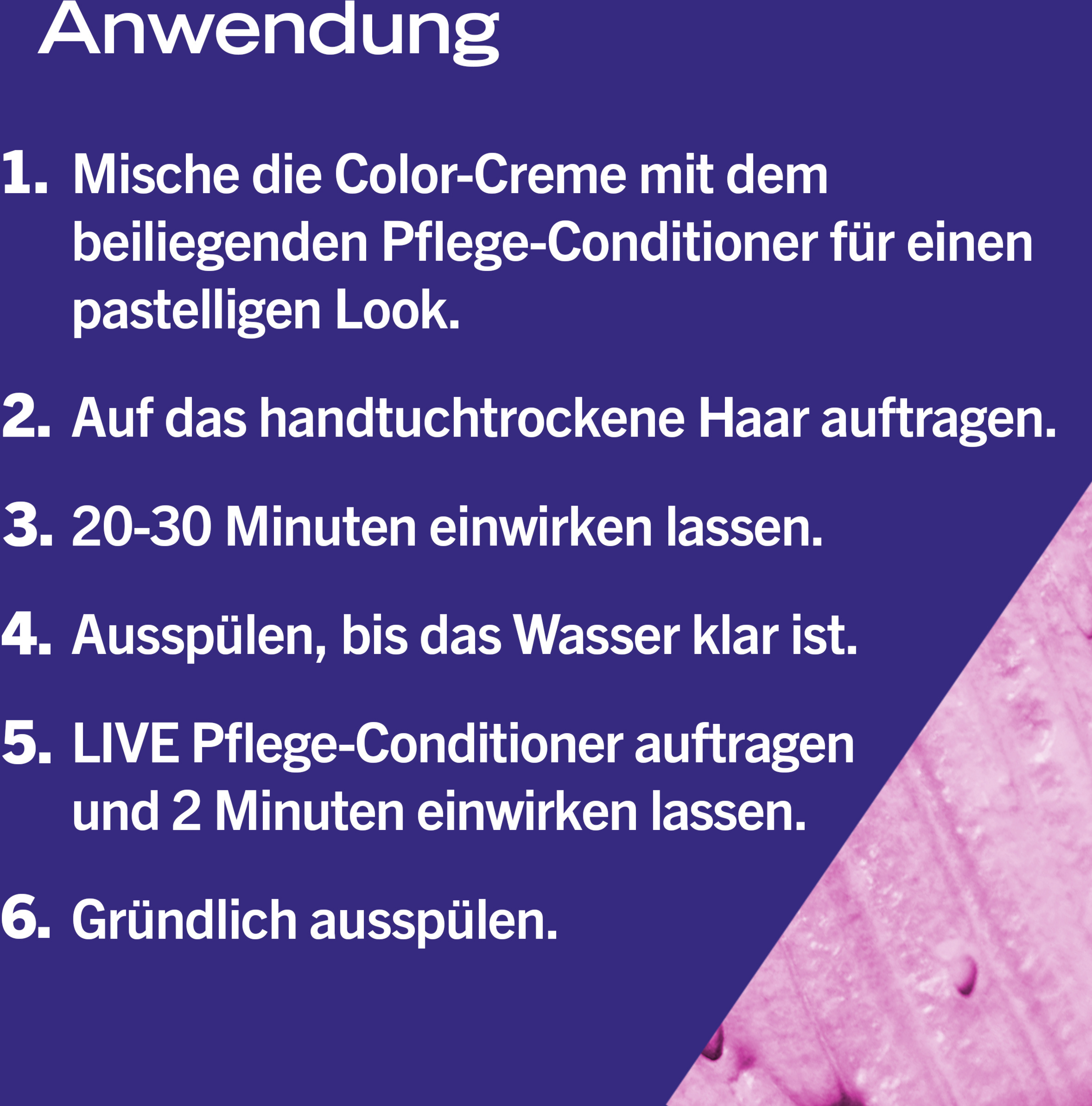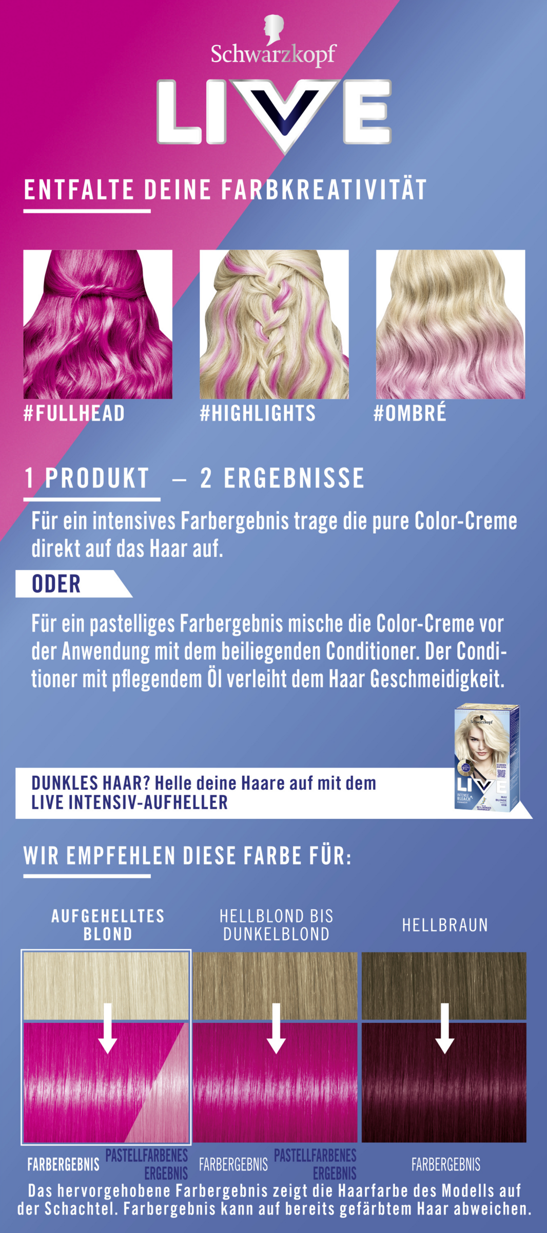 Live Ultra Brights-farven giver intense eller pastelfarvede resultater, der holder i 12-15 shampooer, afhængigt af anvendelsen: Påført direkte giver den håret en intens glød, blandet med den medfølgende conditioner skaber den et pastelagtigt look. Det midlertidige hårfarvemiddel er også velegnet til alle hårtyper. Conditioneren med vitaminer og olie sikrer intensiv hårpleje efter farvning.