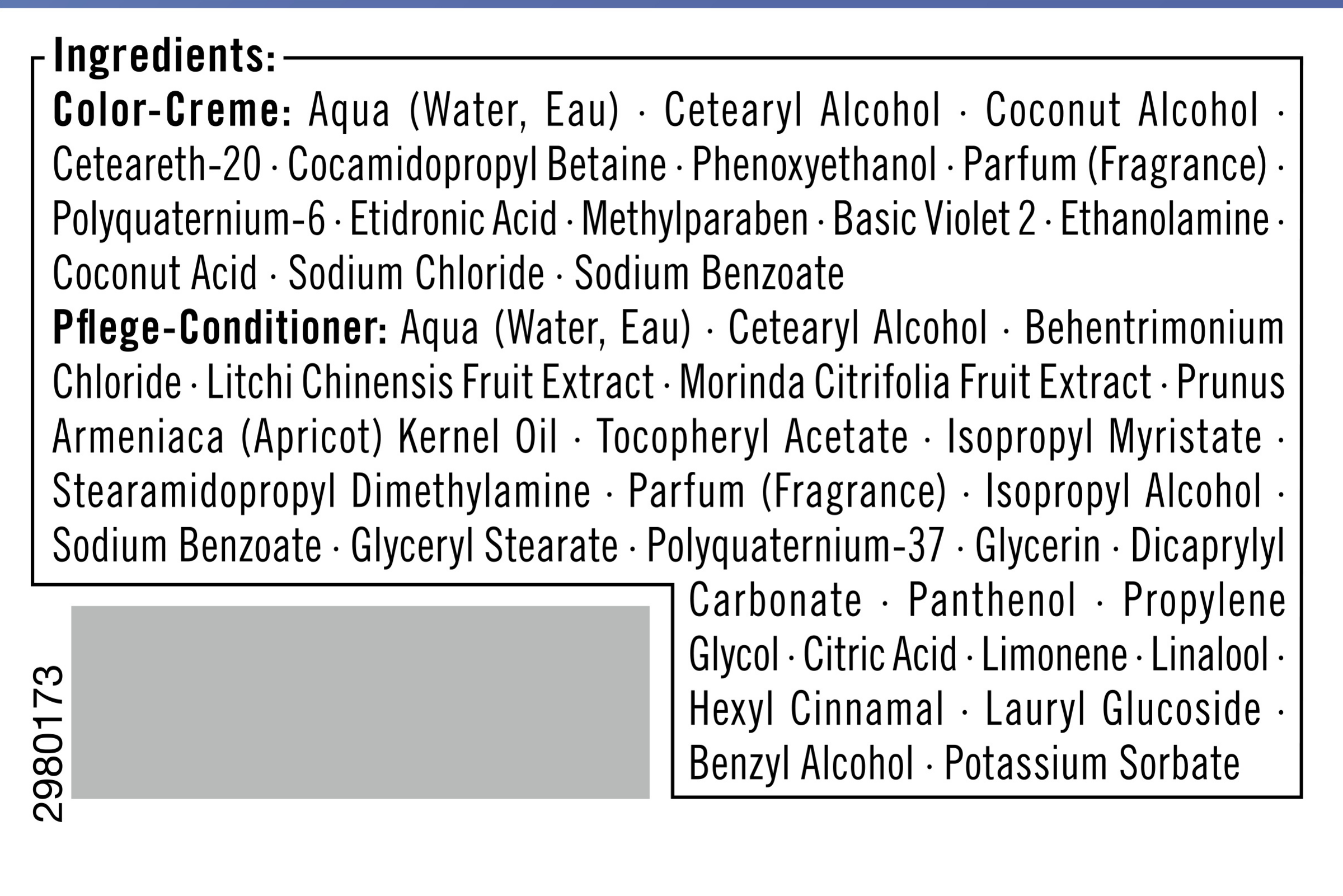 Color-Creme: Aqua (Water, Eau), Cetearyl Alcohol, Coconut Alcohol, Ceteareth-20, Cocamidopropyl Betaine, Phenoxyethanol, Parfum (Fragrance), Polyquaternium-6, Etidronic Acid, Methylparaben, Basic Violet 2, Ethanolamine, Coconut Acid, Sodium Chloride, Sodium Benzoate