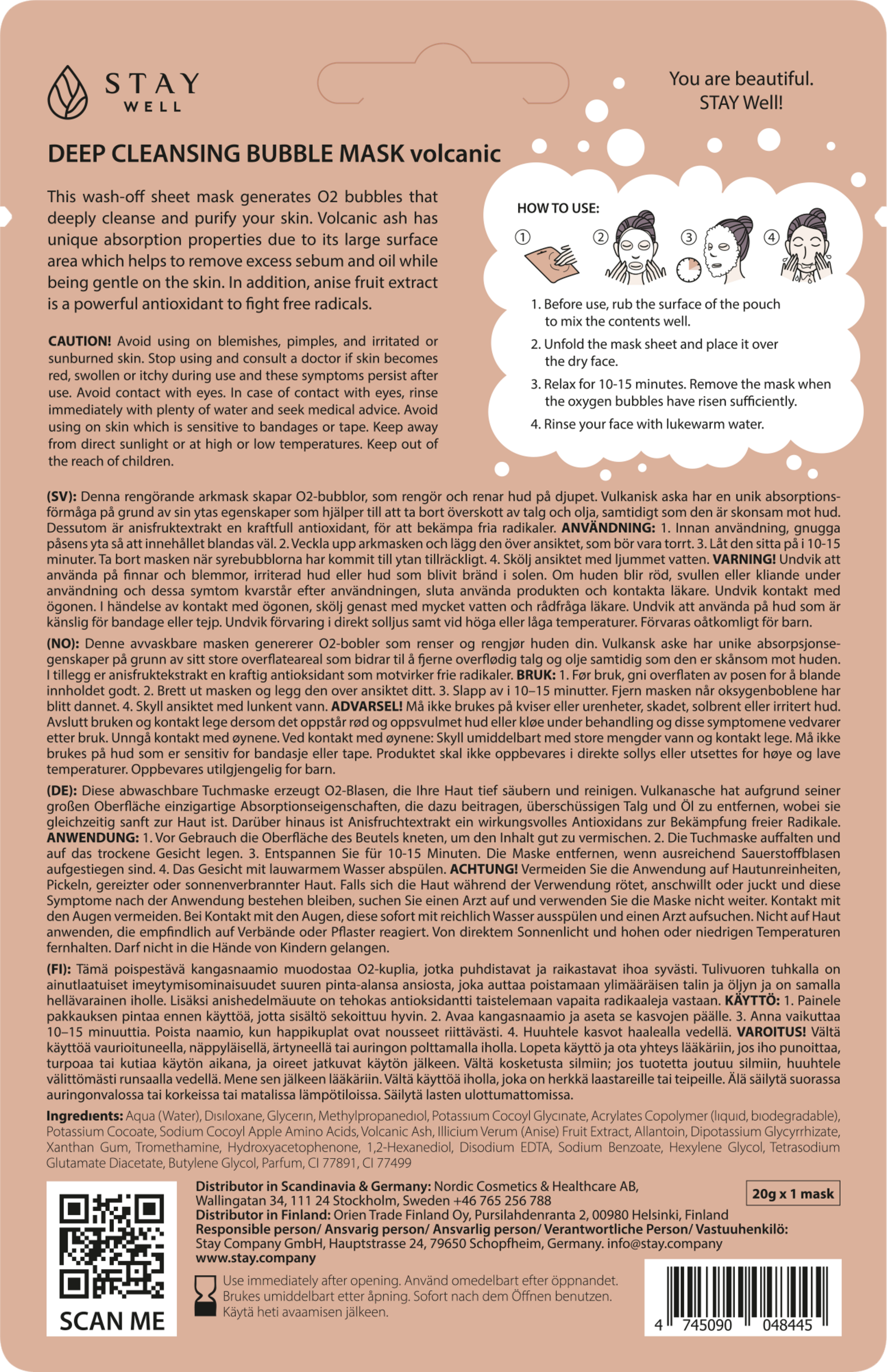 Denne vaskbare sheet-maske skaber O2-bobler, som renser huden i dybden. Vulkansk aske har unikke absorptionsegenskaber på grund af sit store overfladeareal, hvilket hjælper med at fjerne overskydende talg og olie, samtidig med at det er skånsomt for huden. Desuden er anisfrugtekstrakt en effektiv antioxidant til bekæmpelse af frie radikaler.