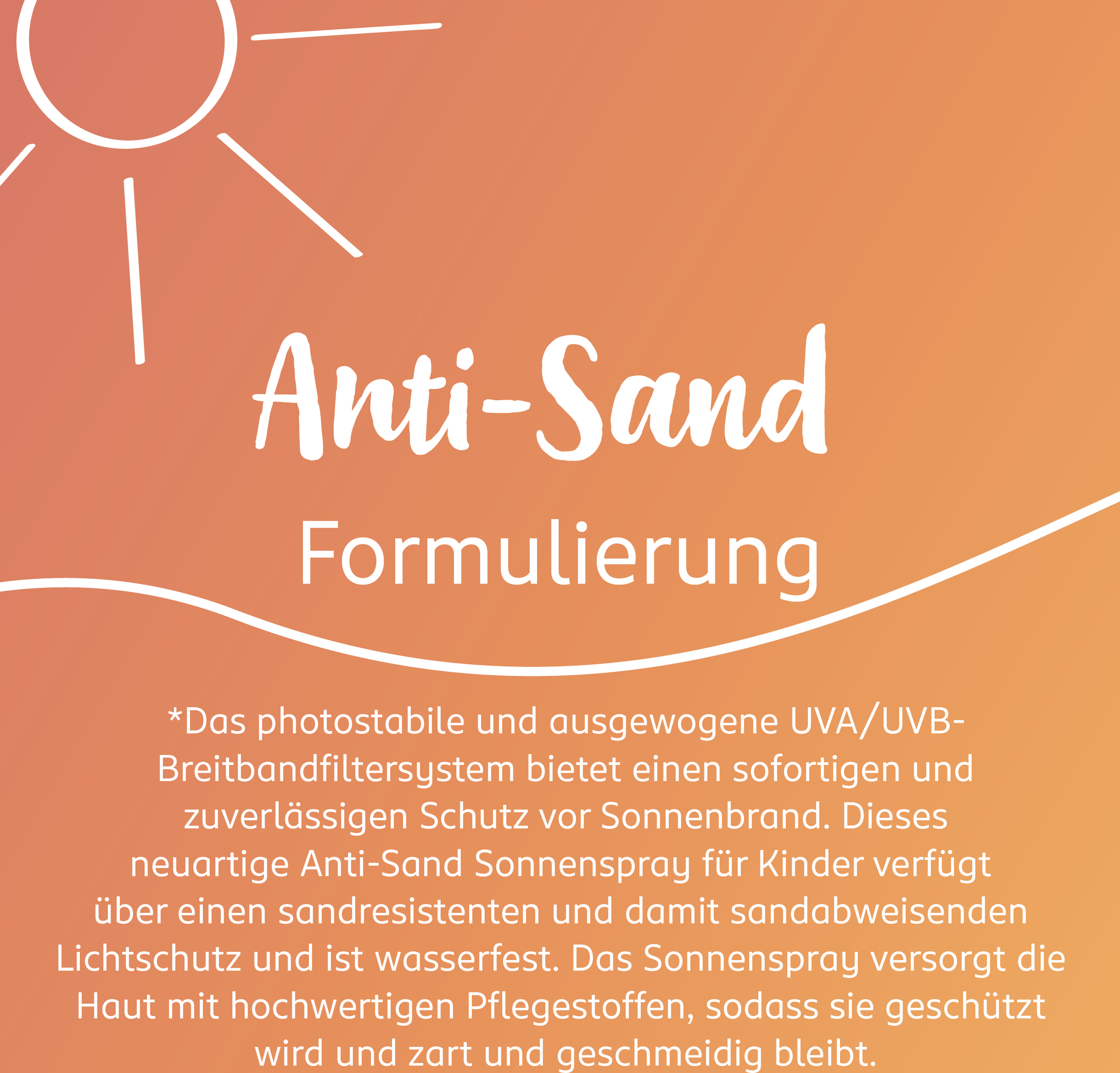 *Det fotostabile og balancerede UVA/UVB-bredspektret filtersystem giver øjeblikkelig og pålidelig beskyttelse mod solskoldning. Dette innovative Anti-Sand solspray til børn har en sandresistent, sandafvisende solbeskyttelse og er vandfast. Solsprayet forsyner huden med kvalitetsplejestoffer, således at huden bliver beskyttet og forbliver blød og smidig. **efter 40 minutters ophold i vandet forbliver mindst 50% af den deklarerede solfaktor.