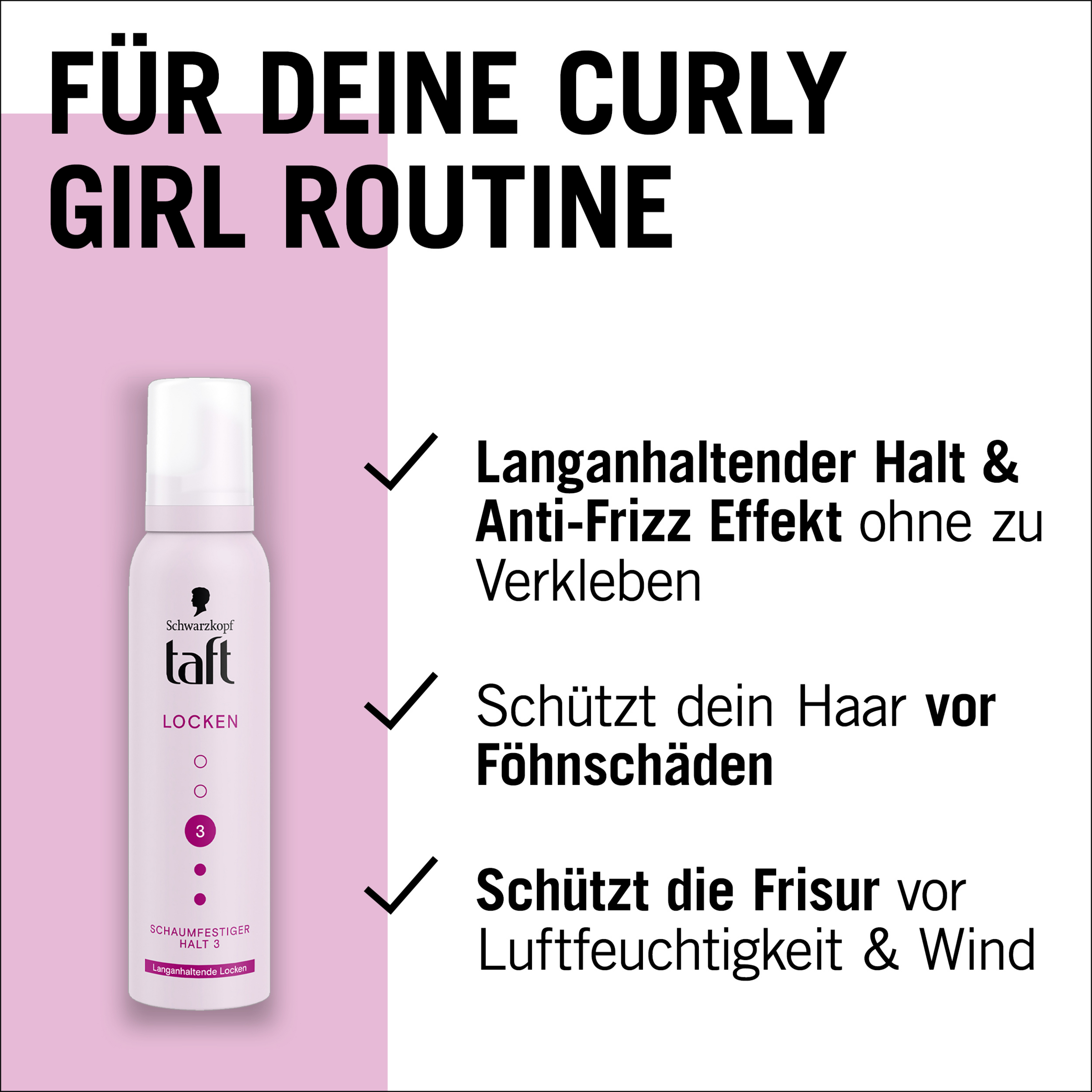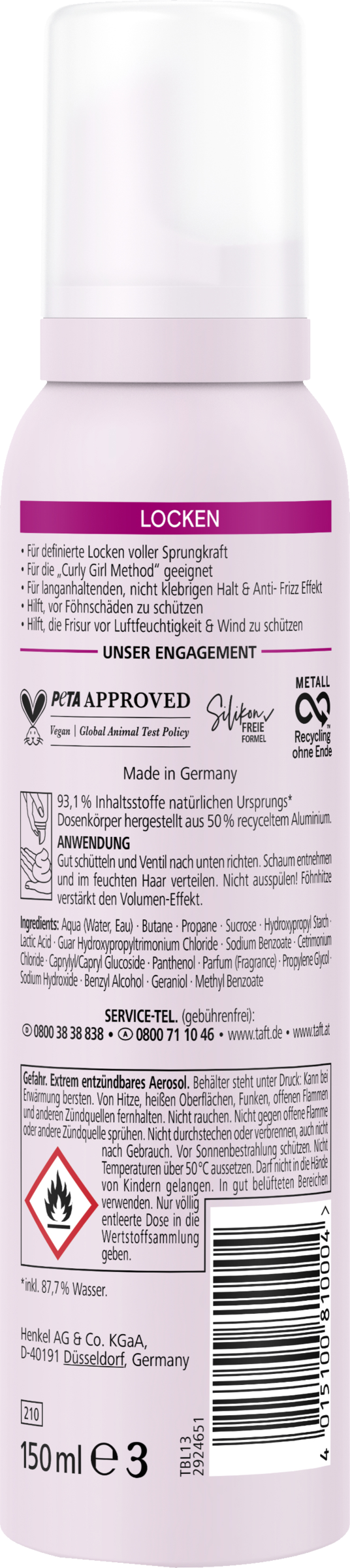 Den innovative taftkrølleformel sikrer langvarige og definerede krøller, fulde af elasticitet. Hårmoussen giver et langvarigt hold og en anti-frizz-effekt uden at klistre. TAFT-moussen hjælper med at beskytte håret mod skader fra føntørring. Dette hårstylingprodukt giver frisurer et stærkt hold, selv under vejrforhold som fugtighed og vind. TAFT-produkter bruger veganske formler og er certificeret af PETA. Formlen er fri for silikoner. 93,1 % af ingredienserne er af naturlig oprindelse. Flasken er fremstillet af 50 % genbrugsplast**.