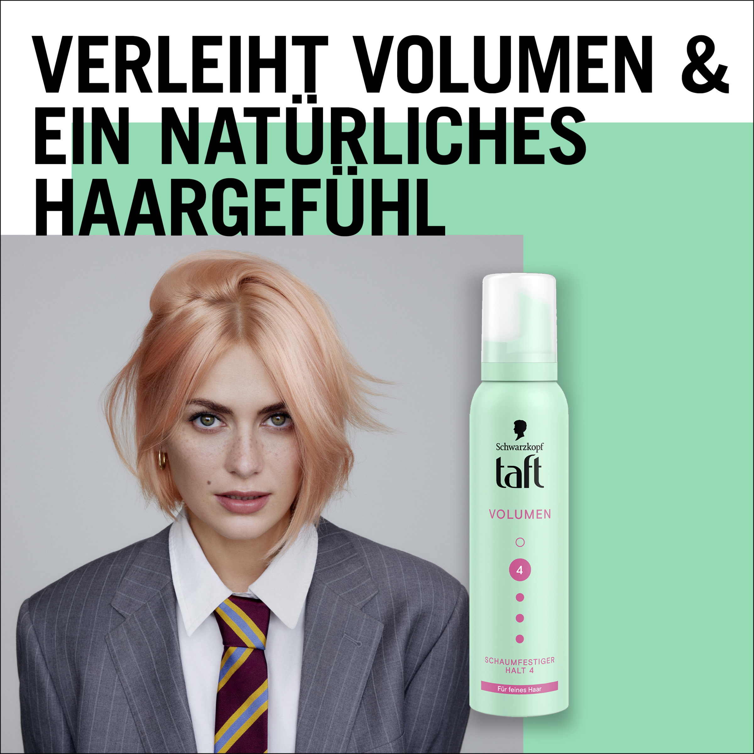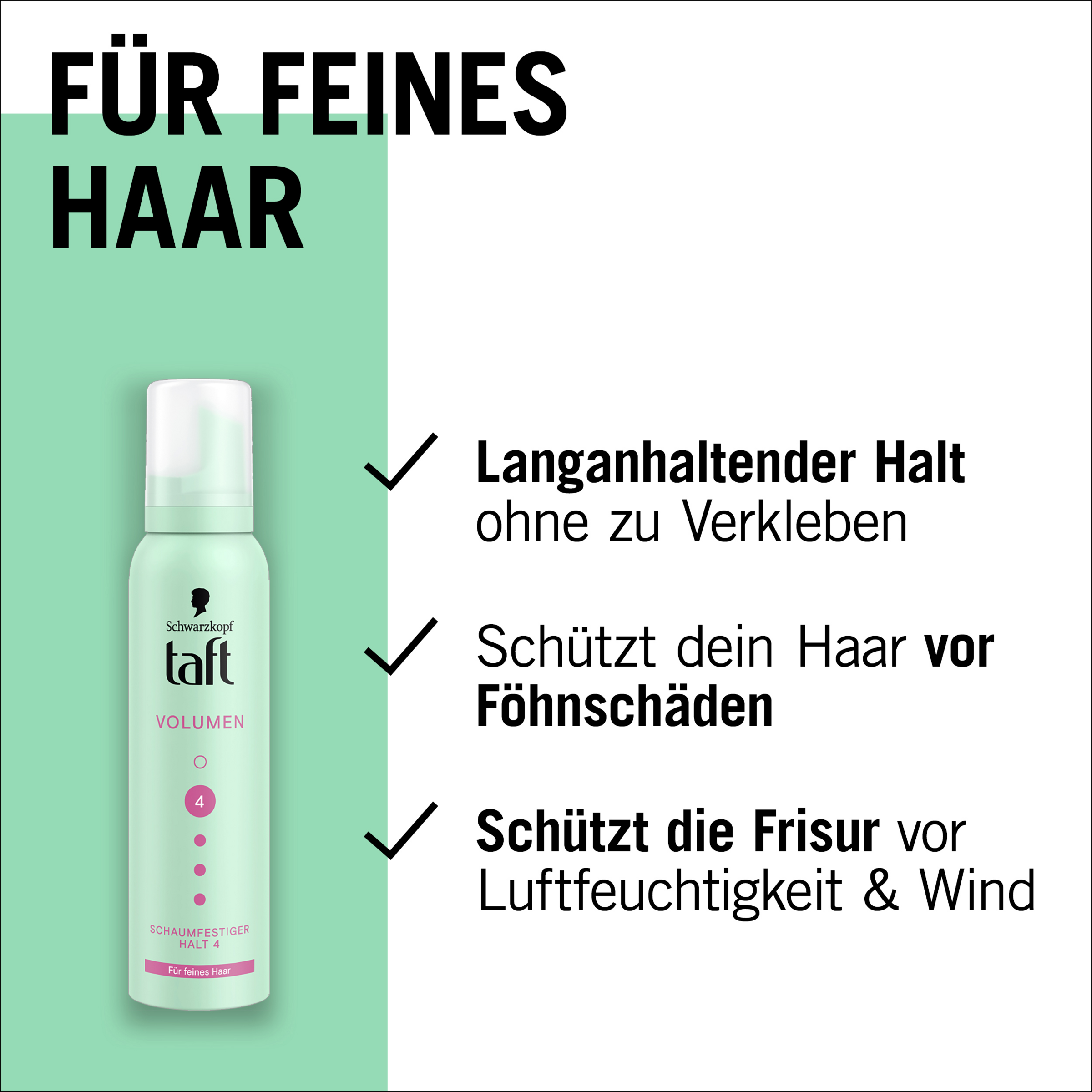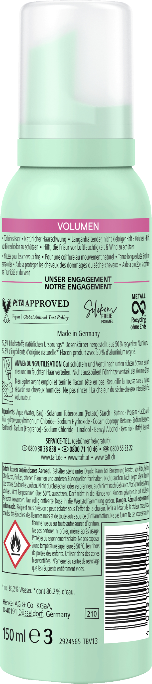 Den innovative taffeta-volumenformel giver volumen og naturlig bevægelse i håret og er særligt velegnet til fint hår. Den giver langvarigt hold og volumen uden at klistre. Denne TAFT-mousse hjælper med at beskytte håret mod skader fra føntørring. Dette hårstylingprodukt giver et stærkt hold, selv under vejrforhold som fugtighed og vind. TAFT-produkter bruger veganske formler og er certificeret af PETA. Formlen er fri for silikoner. 92,8 % af ingredienserne er af naturlig oprindelse*. Flasken er fremstillet af 50 % genbrugsplast**.