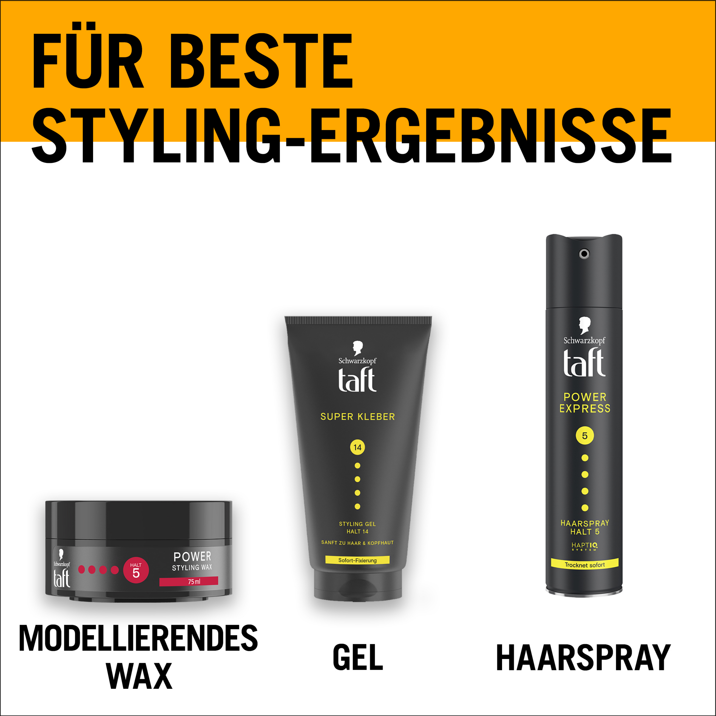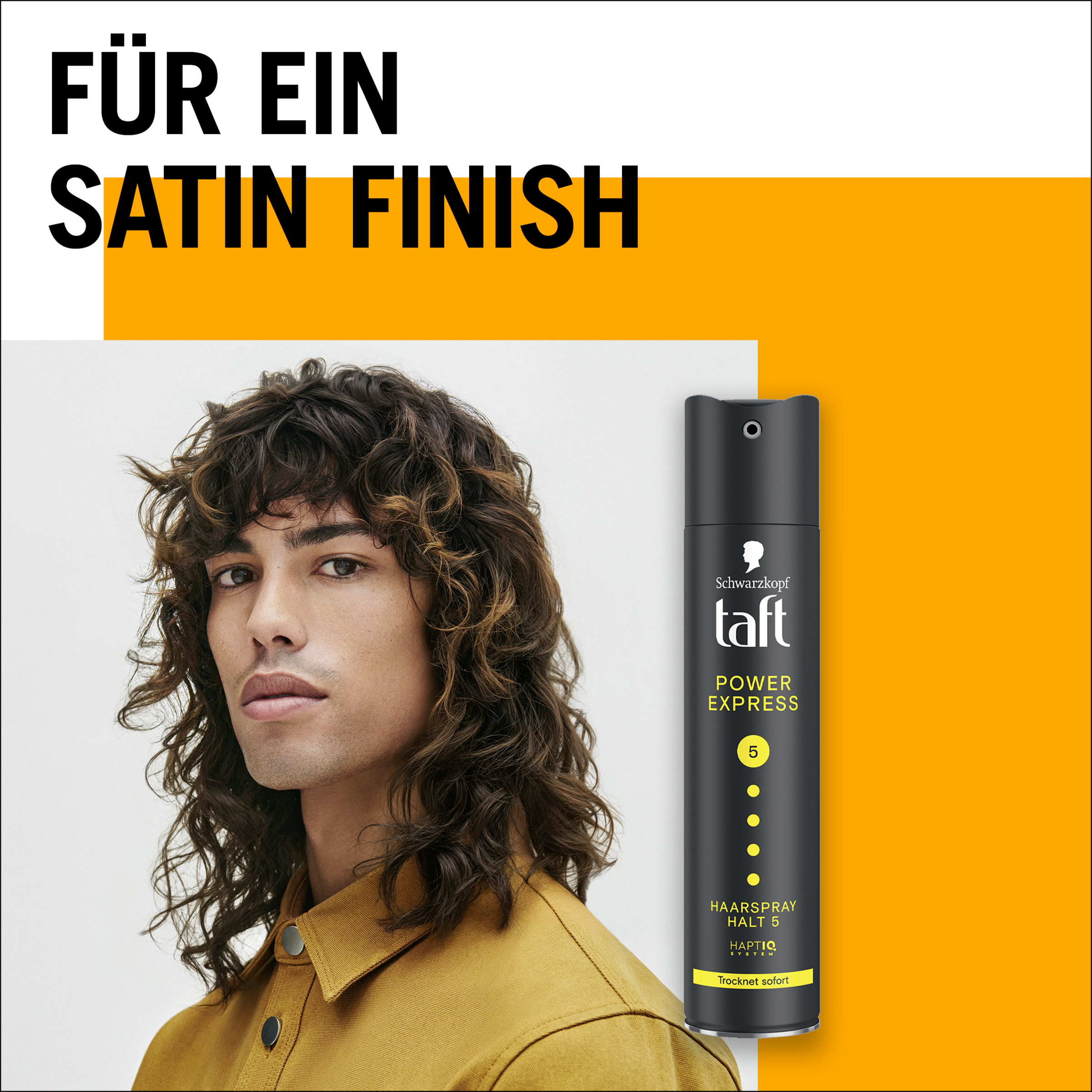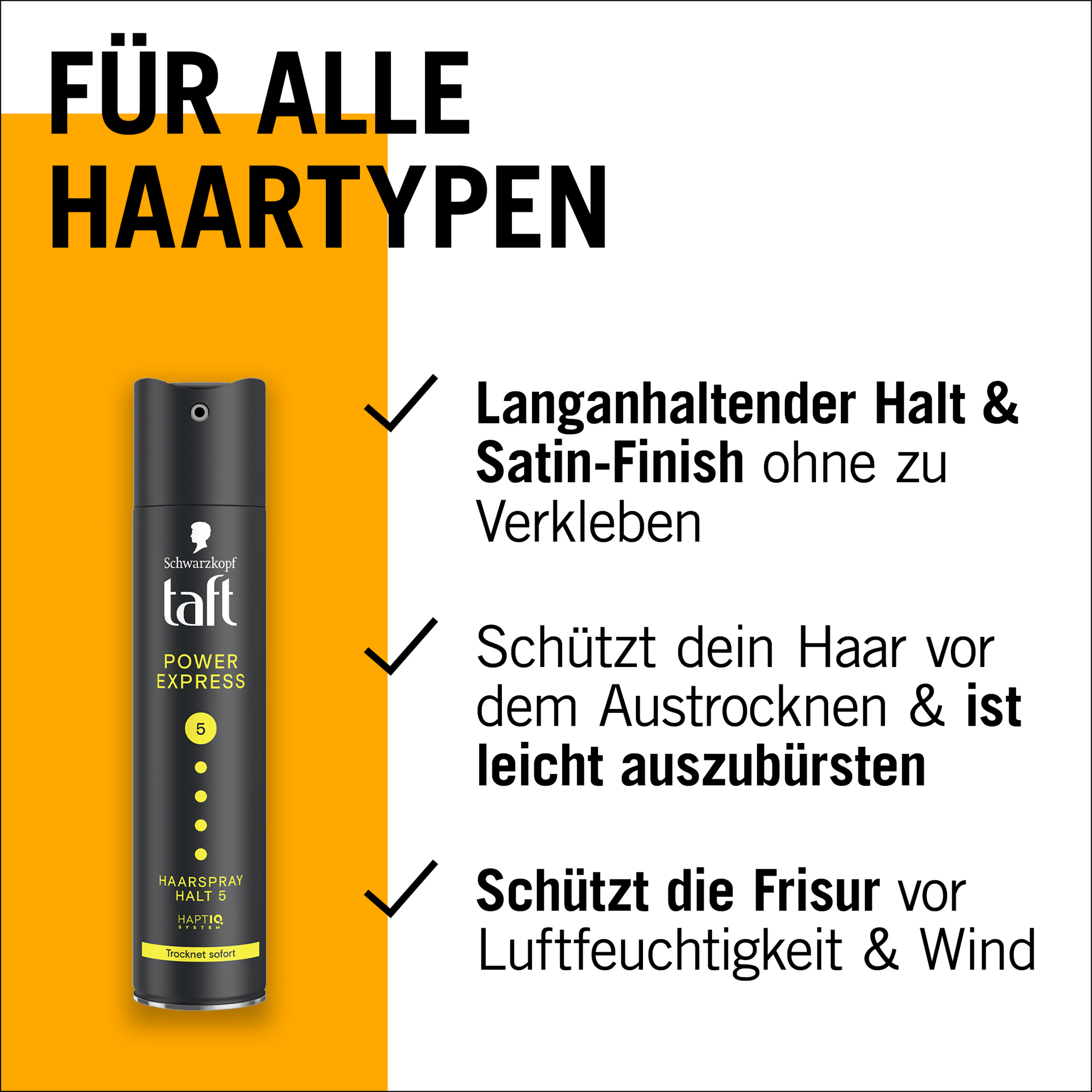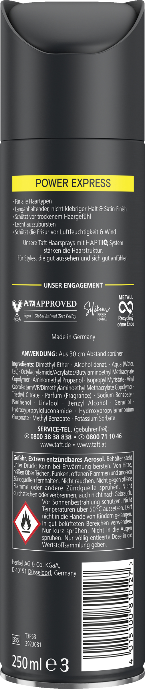 Den innovative Taft Power Express-formel tørrer øjeblikkeligt og giver håret en silkeblød finish. Giver langvarigt hold uden at klistre, samtidig med at det er let at børste ud. Den hurtigtørrende Taft-hårspray hjælper med at beskytte håret mod at føles tørt. Denne stylinghårspray med hurtigtørrende egenskaber giver din styling hold, selv under ugunstige vejrforhold som fugt og vind. Taft-hårsprayen indeholder HAPTIQ-systemet, der skaber mikrobindinger og styrker hårets struktur. For smukke frisurer, som du kan se og føle. Tafts hårspray-produkter anvender veganske formler og er fri for animalske ingredienser. Formlen er fri for silikoner.