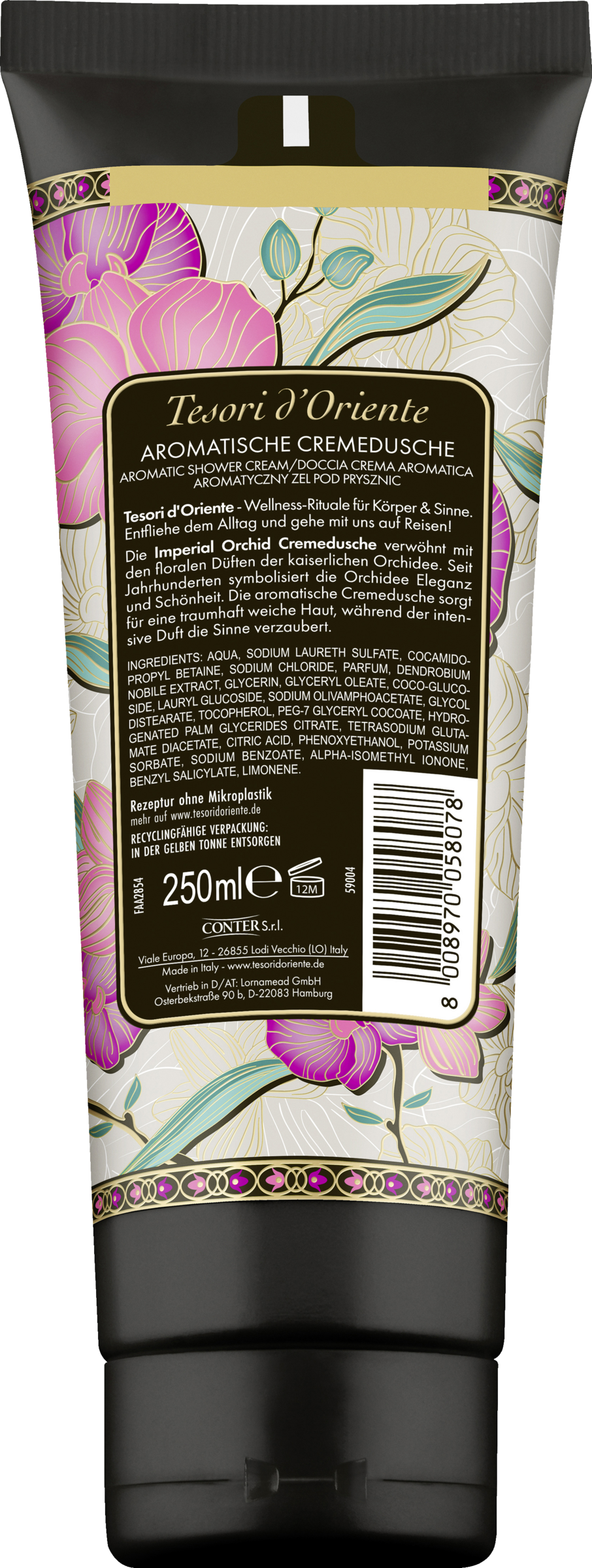 Imperial Orchid Ritual cremebruseren forkæler dig med blomsterdufte fra den kejserlige Orkidé. Orkidé har symboliseret Eleganz og skønhed i århundreder. Den aromatiske cremebruser sikrer en vidunderlig blød hud, mens den intense Duft fortryller sanserne.
