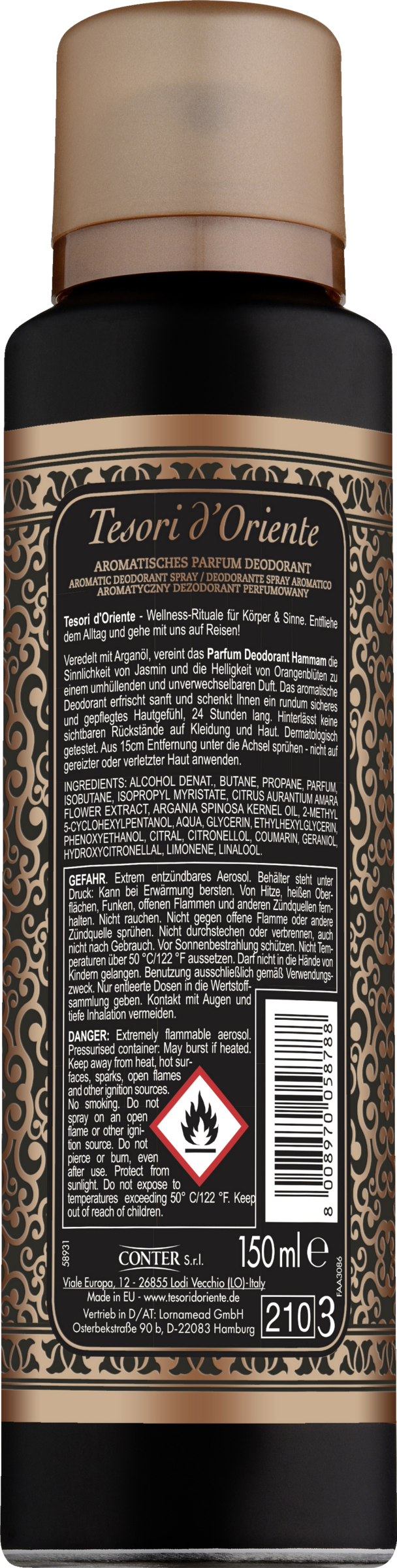 Hammam deodorant parfume er beriget med arganolie og kombinerer sensualiteten fra jasmin og lysstyrken fra appelsinblomst for at skabe en indhyllende og umiskendelig duft. Den aromatiske deodorant opfrisker blidt og får din hud til at føles helt sikker og velplejet, 24 timer i døgnet. Efterlader ingen synlige rester på tøj og hud.