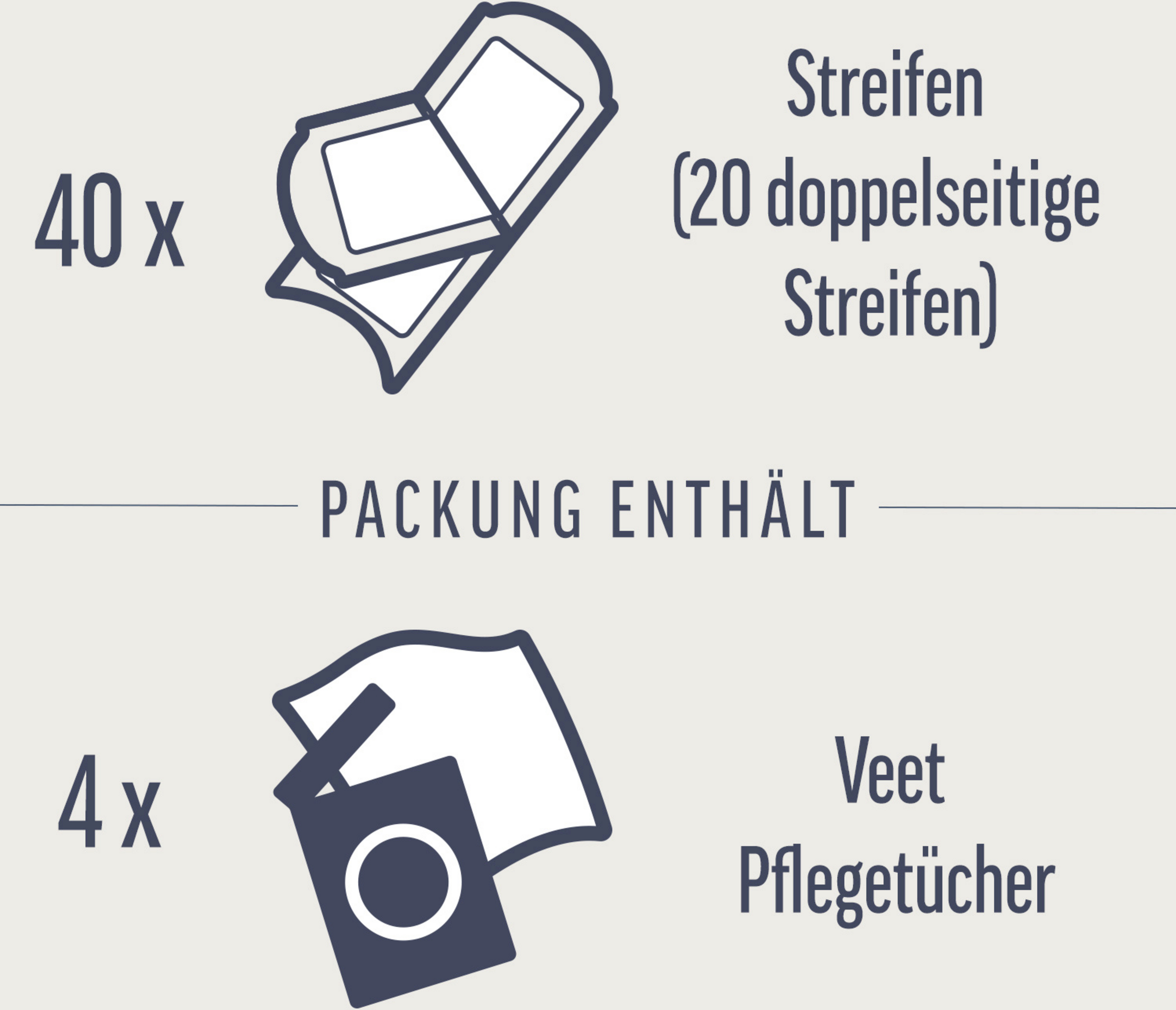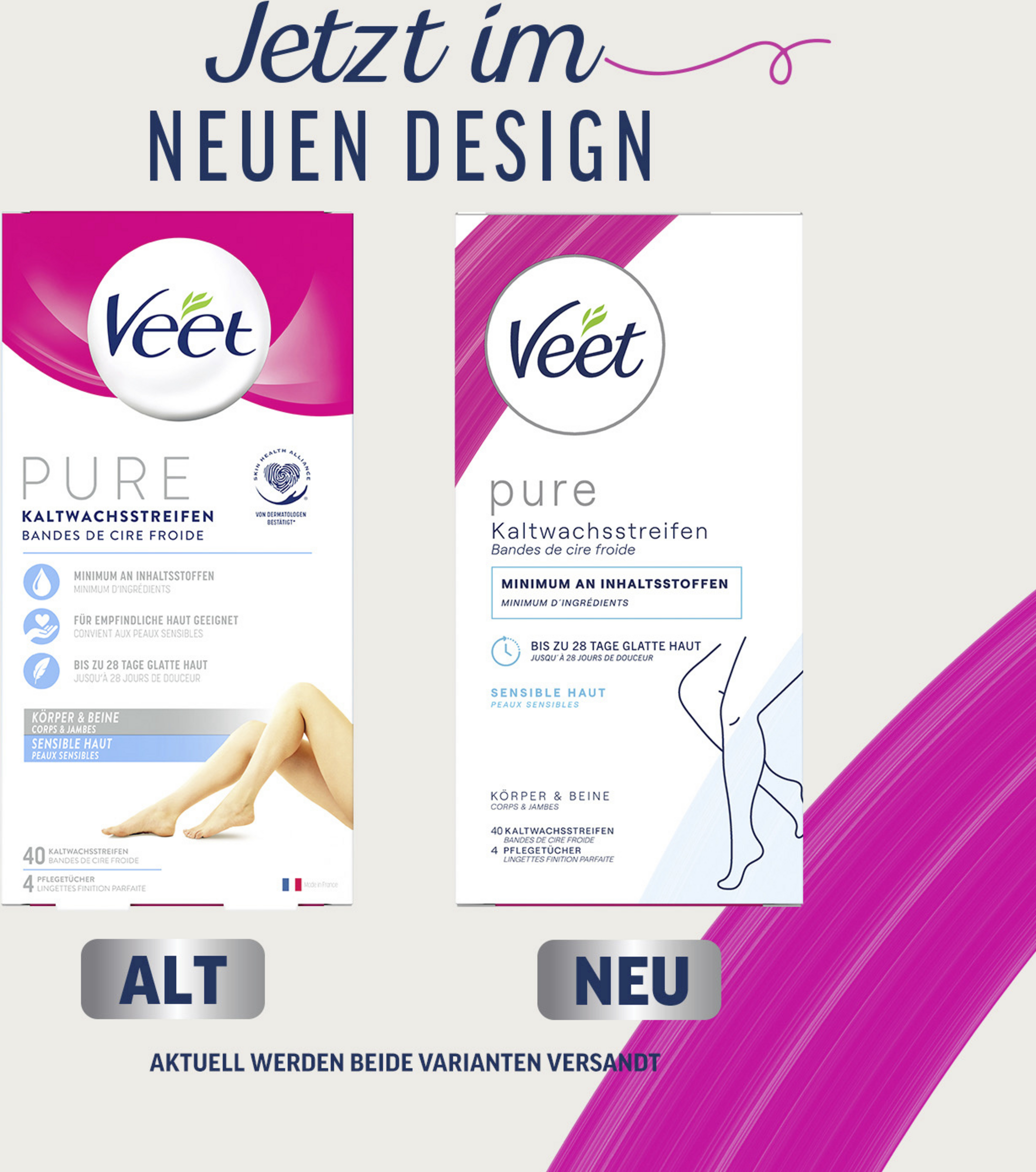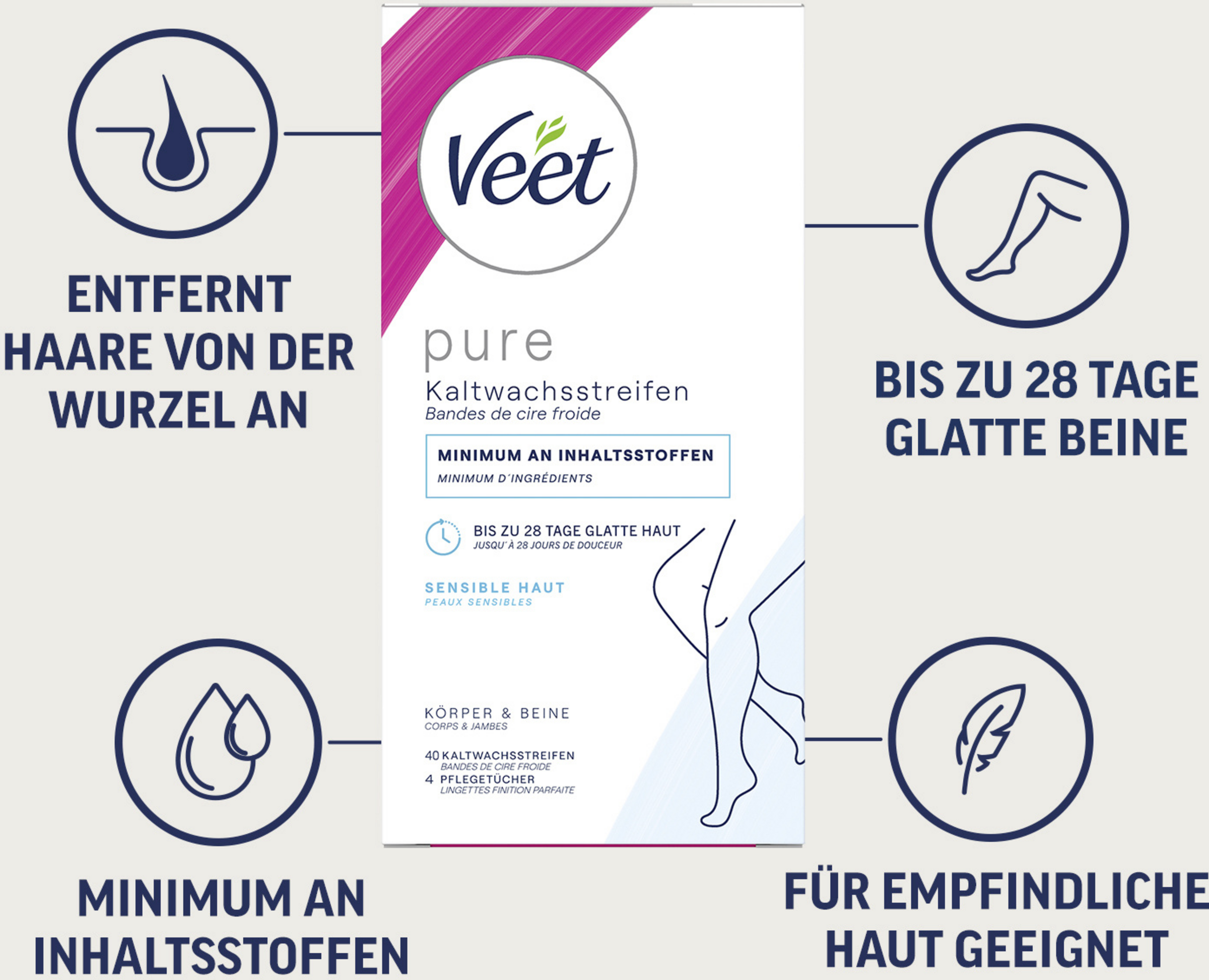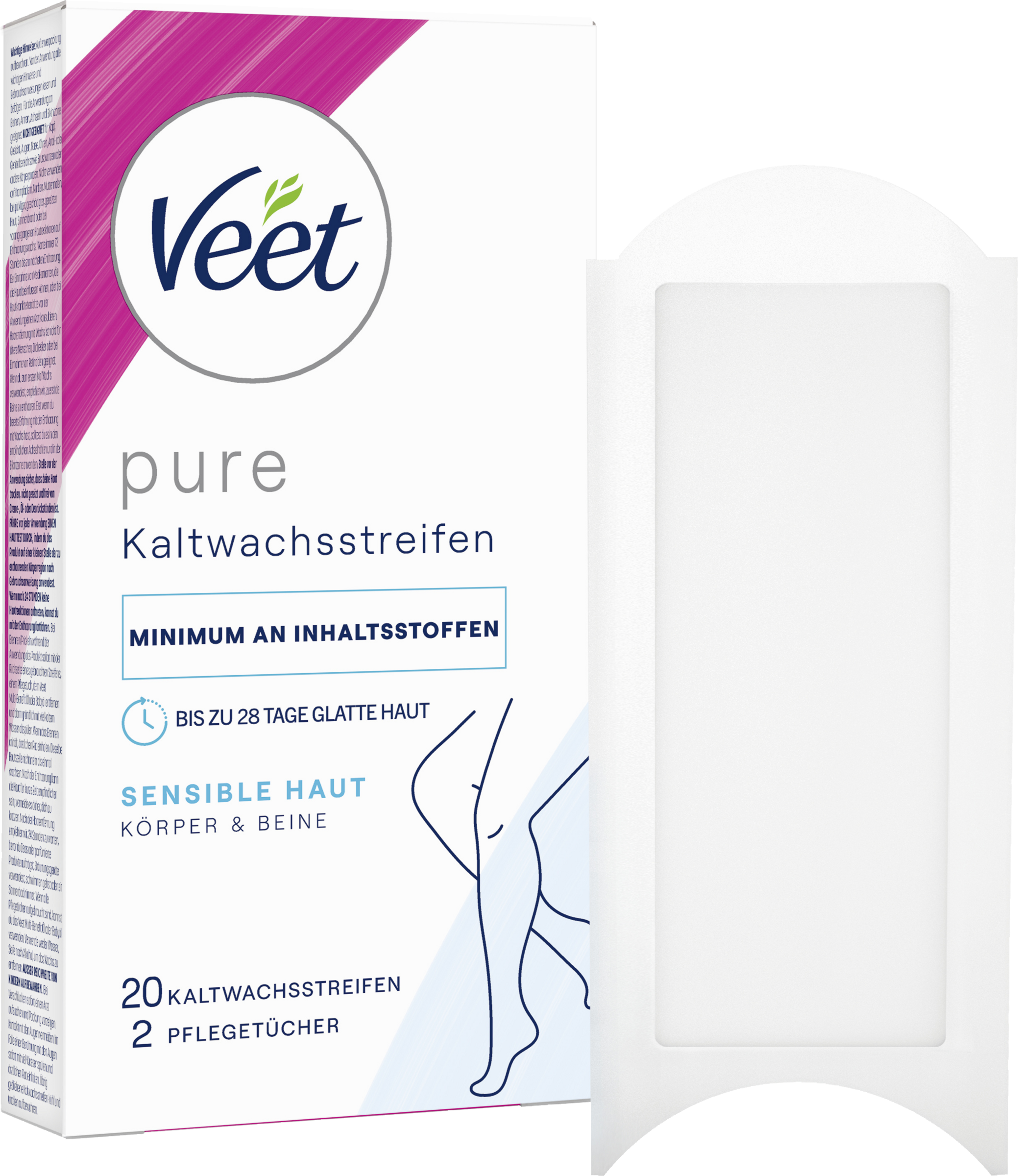 Sommeren er lige om hjørnet og med den endelig luftigt tøj, ferier og besøg i svømmehallen. Du vil sikkert gerne vise dine glatte ben og ikke konstant at skulle barbere dig. Vores kolde voksstrimler til Krop og ben er lige sagen til dette, da de giver glat hud i op til 28 dage. Vores kolde voksstrimler er også velegnede til følsom hud og indeholder takket være den nye Veet PURE voksformel kun et minimum af de nødvendige ingredienser. Du kan fjerne selv kort Hår inklusive roden uden risiko for snitsår eller irriterende skægstubbe!