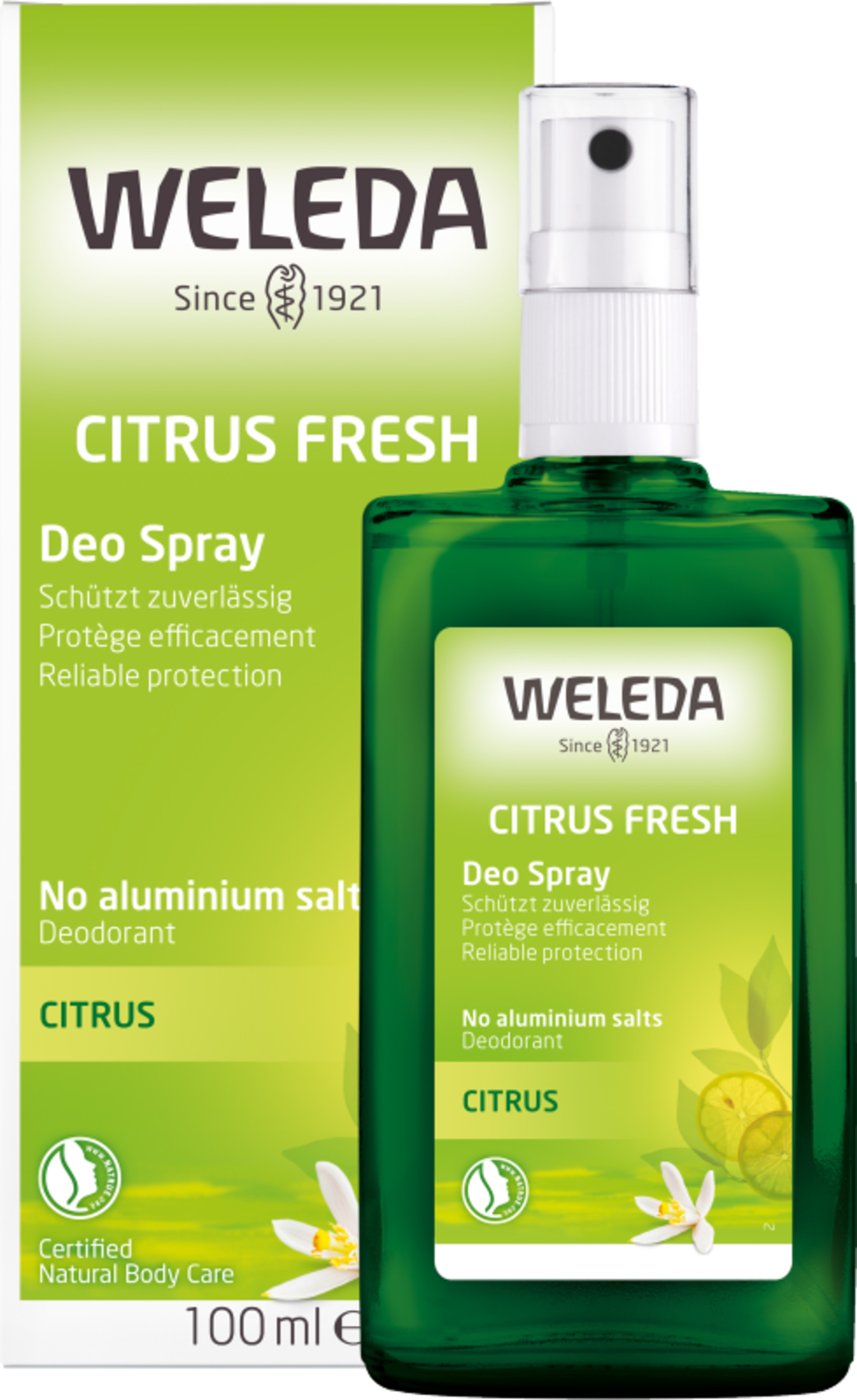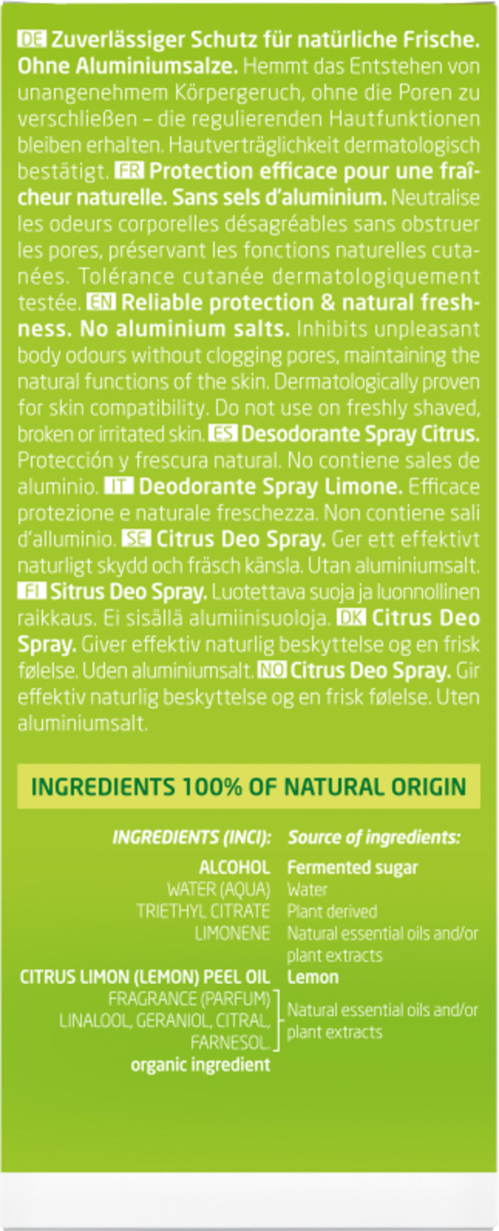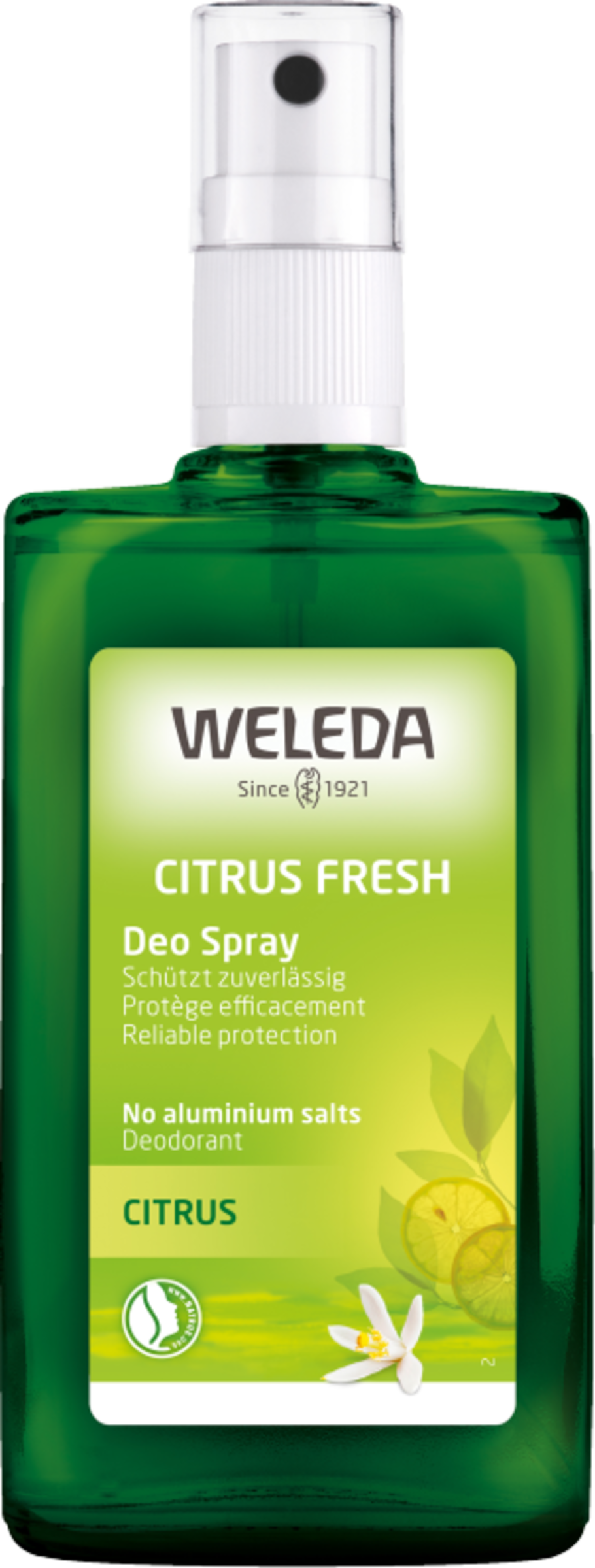 Citrus Fresh Deospray omgiver dig med en forfriskende brise af frugtagtig citronfriskhed - uden at lukke dine porer. Æteriske olier fra skallen af citrusfrugter har en mild deodorant-effekt uden at påvirke de naturlige hudfunktioner. Det betyder, at de naturlige udskillelsesprocesser gennem huden, som er vigtige for en sund organisme, ikke forhindres, og porerne tilstopper ikke. Effektivitet og hudvenlighed er dermatologisk testet. Uden aluminiumsalte.