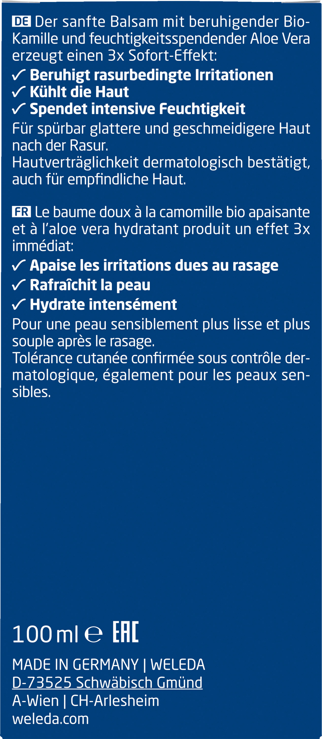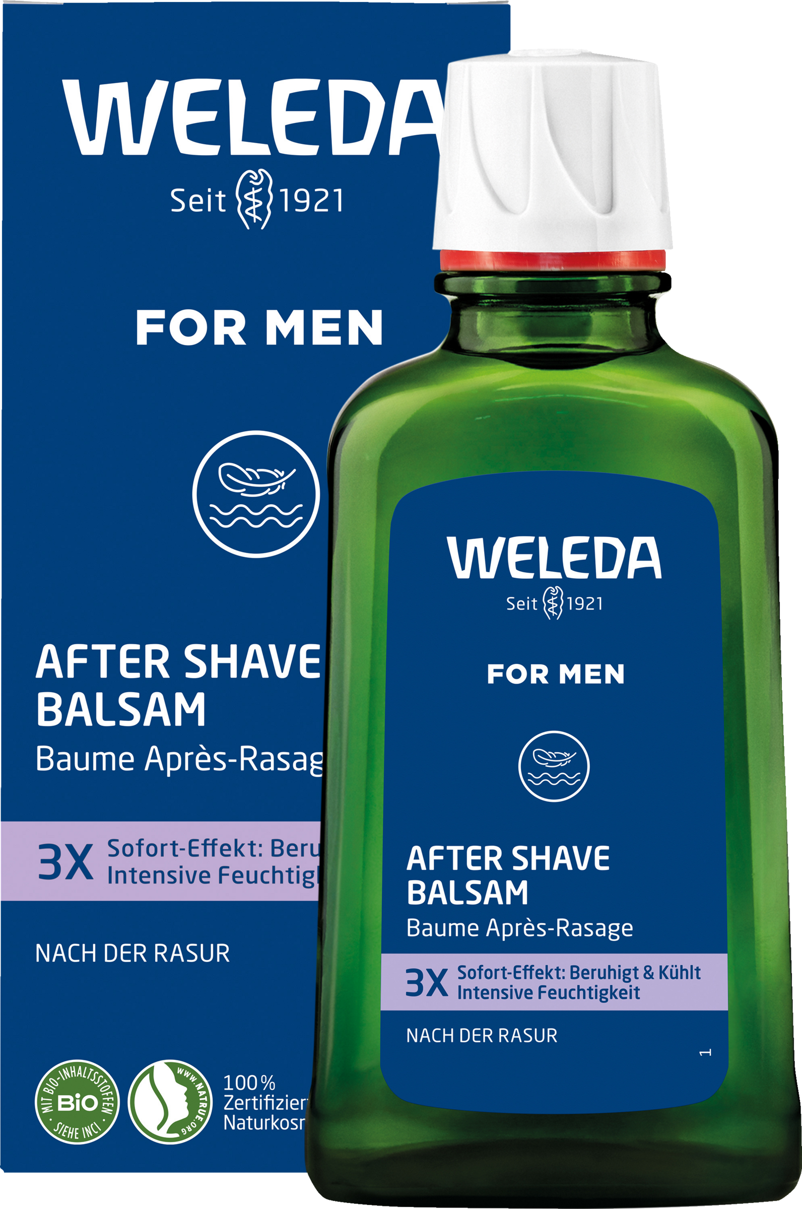 Weleda Aftershave Balsam plejer og beroliger huden naturligt. Ekstrakter af kamille og myrra giver en særlig mild behandling til hud, der er stresset af tør eller våd barbering. Den kølende og fugtgivende aloe-vera gel og jojobaolie beskytter ansigtshuden mod at tørre ud og gør den blød og smidig. Rosmarin, Litsea Cubeba og Tonka giver Weleda After Shave Balm en mild og behageligt forfriskende Duft.