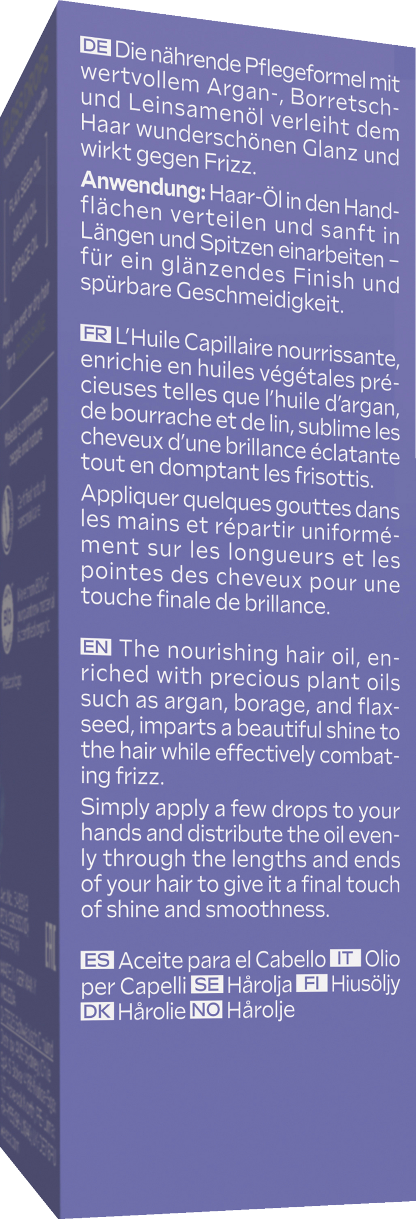 Den nærende plejeformel med værdifuld argan-, borage- og hørfrøolie giver håret smuk glans og bekæmper krus.