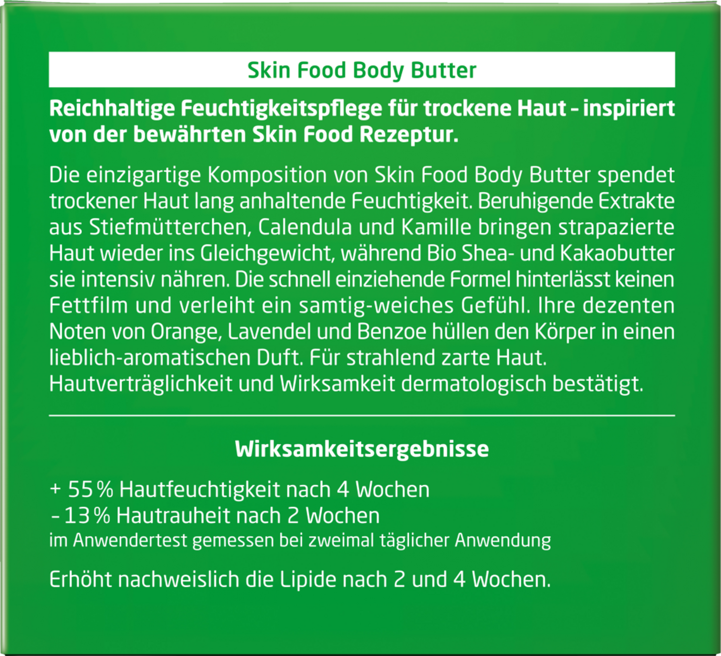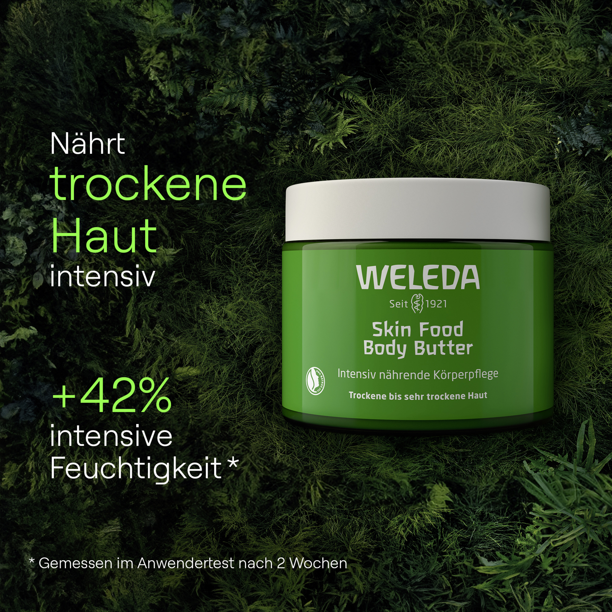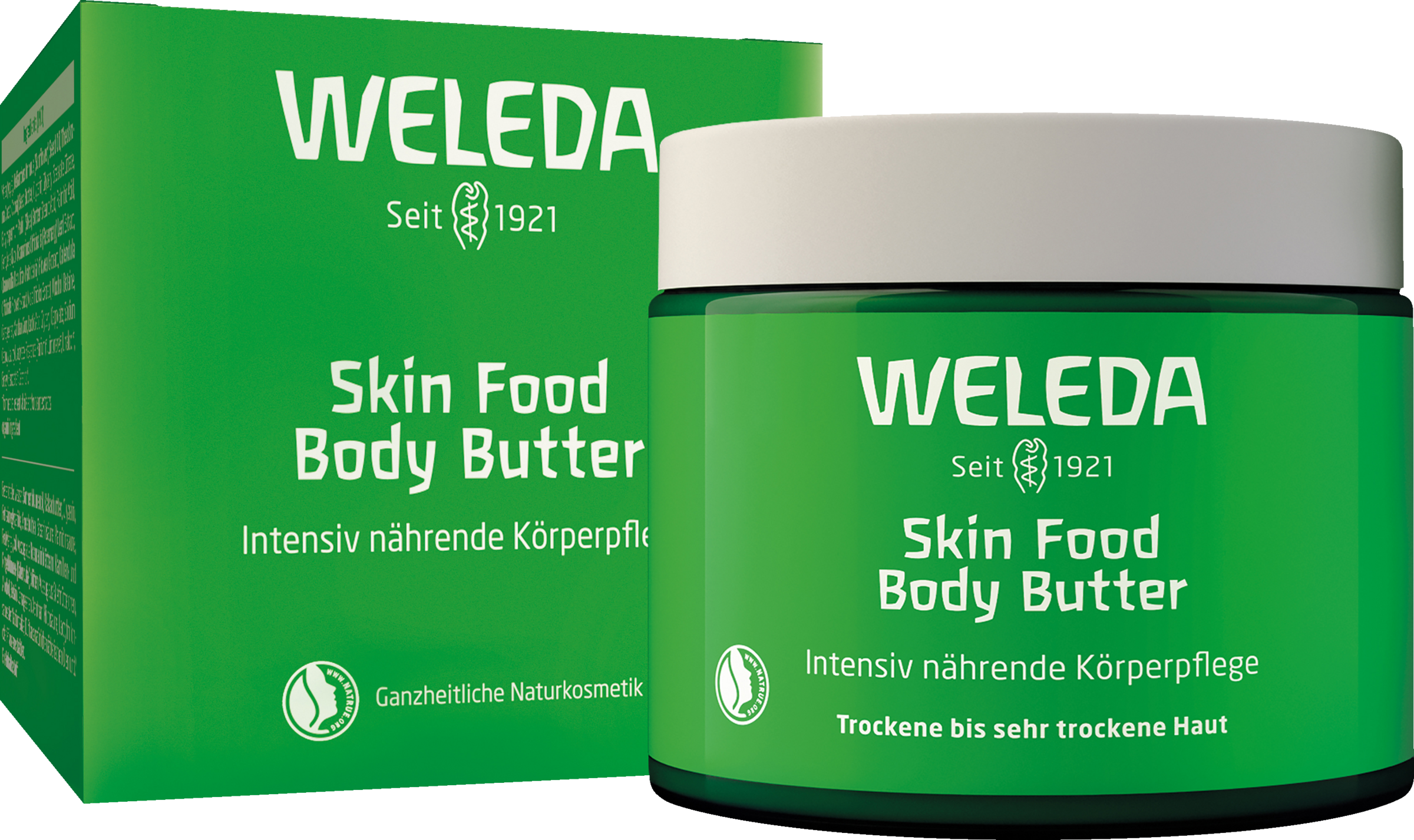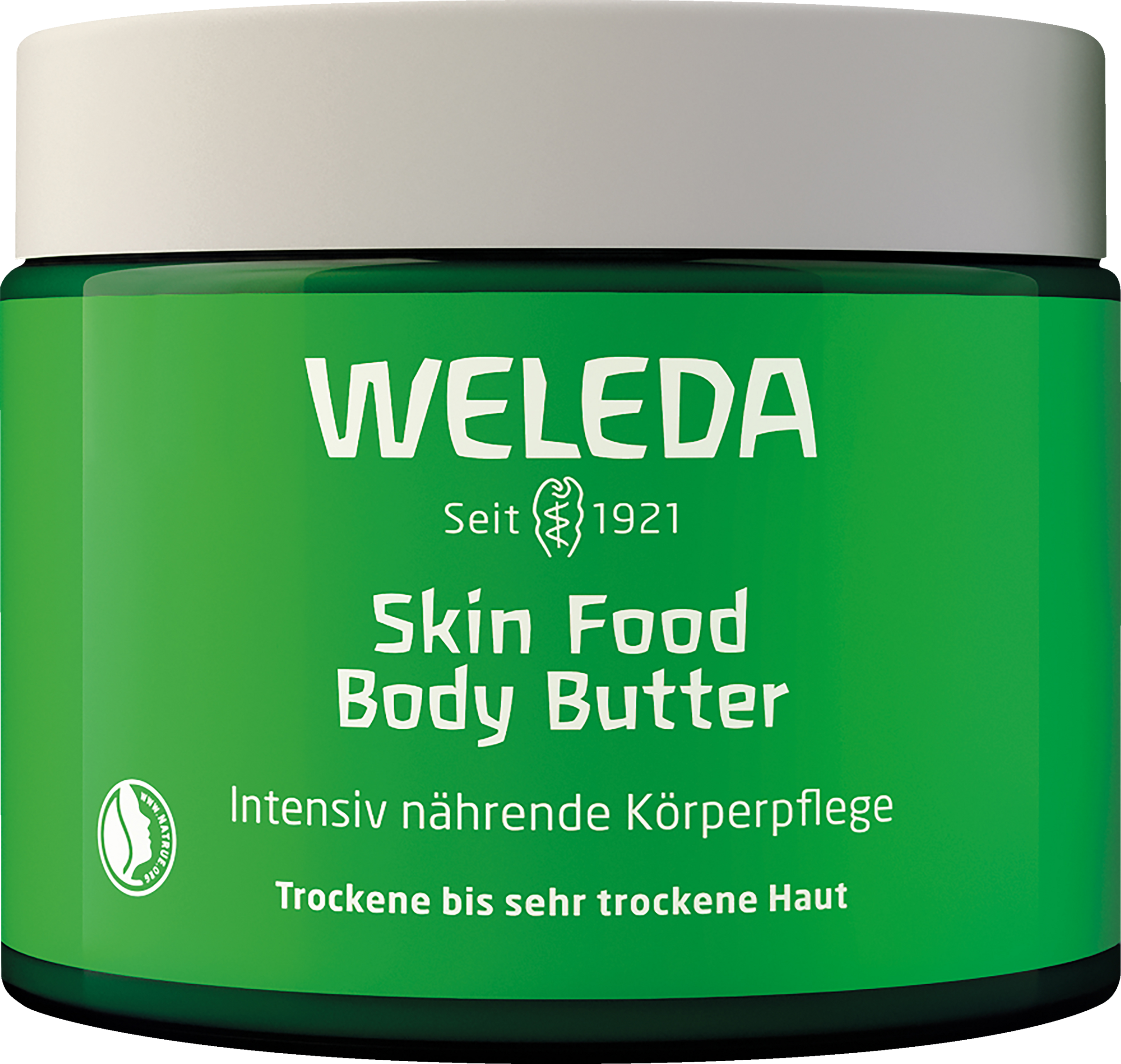 Superfood til huden! Weleda Skin Food Body Butter slukker tørsten fra tør og ru hud og giver den langvarig fugt. Den unikke tekstur i Skin Food Body Butter forvandler den daglige kropspleje til et meget specielt plejeøjeblik: Den unikke creme kan smøres dejlig nemt på huden. Ekstrakter af stedmoderblomst, calendula og kamille beroliger huden, mens Bio shea og Bio Kakaosmør nærer den intensivt. For en fløjlsagtig, blød hud. Tør og ru hud bliver igen smidig og blød og plejes intensivt med værdifulde planteekstrakter.