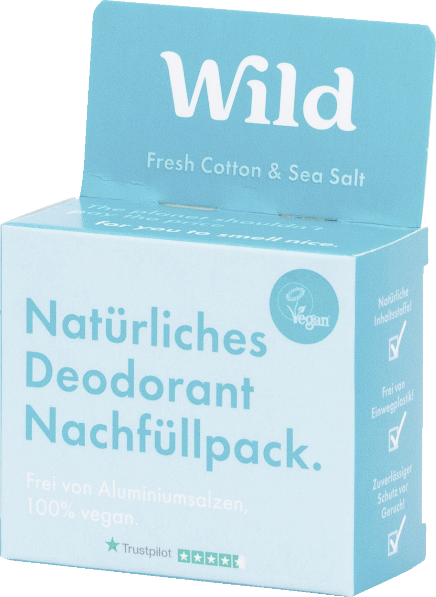 Vildt Refill – Genopfyldelig og naturlig deodorant! Frisk bomuld og havsalt – Inspireret af nyvasket vasketøj, der tørrer i en kølig havbrise. Denne opkvikkende Duft er den perfekte ledsager til en god og frisk start på dagen!