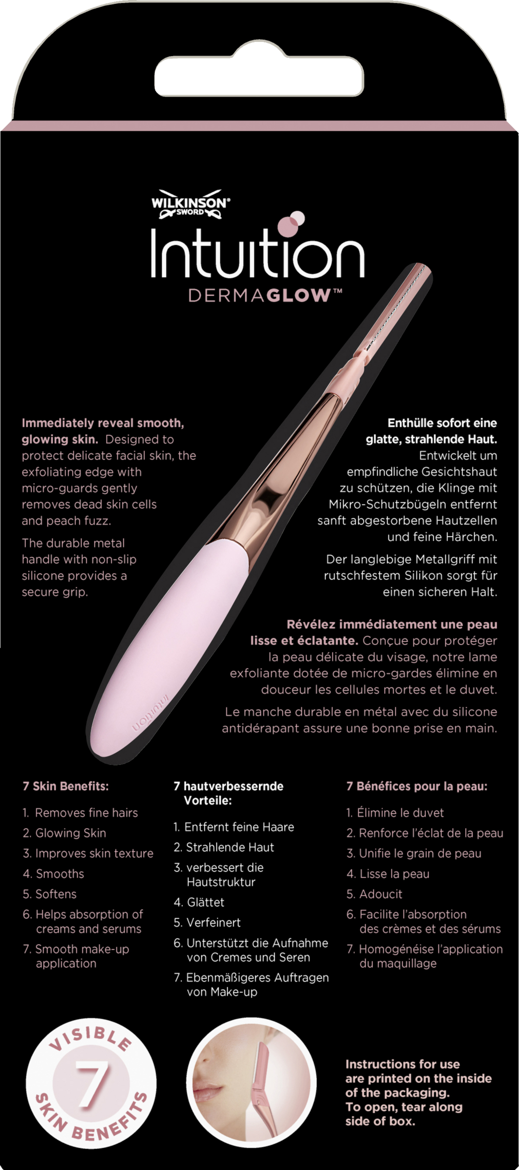 - den eksfolierende kant med mikrobeskyttere fjerner forsigtigt døde hudceller og ferskenhår
