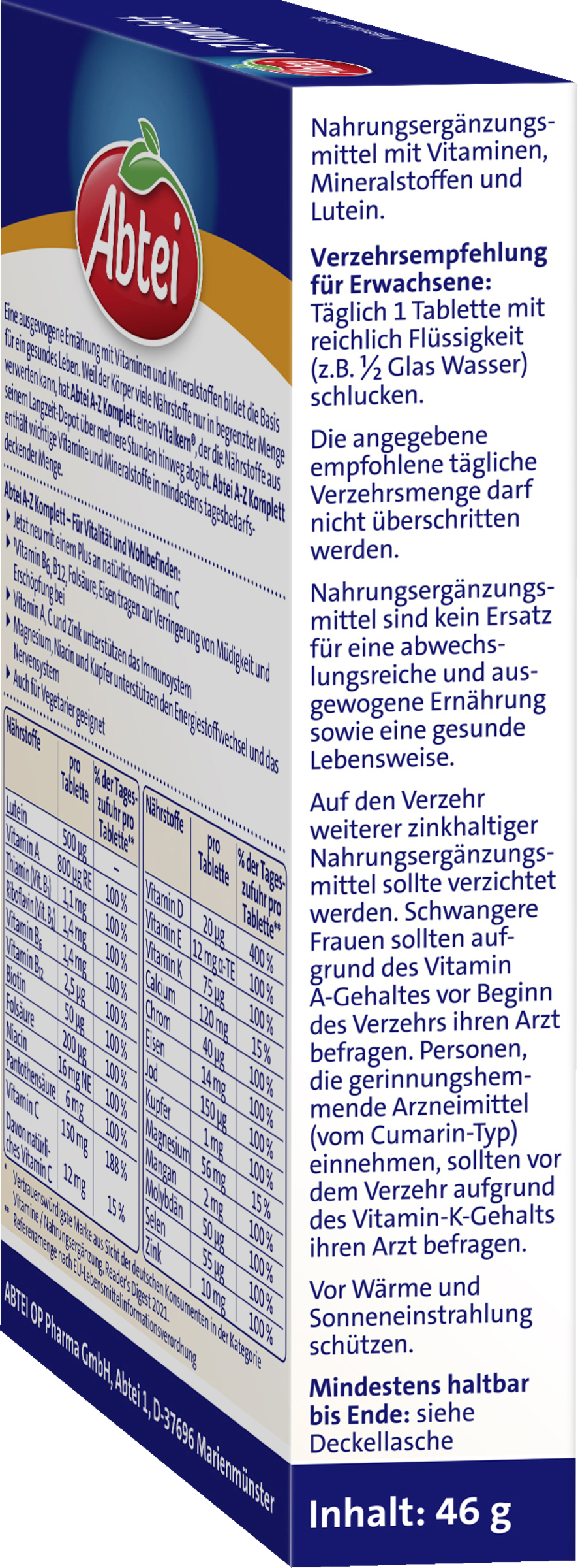 En afbalanceret kost med vitaminer og mineraler danner grundlaget for et sundt liv. Da kroppen kun kan bruge en begrænset mængde næringsstoffer, har Abtei A-Z komplet en vital kerne, som frigiver næringsstofferne fra sit langtidsdepot i flere timer. Abtei A-Z Komplet indeholder vigtige vitaminer og mineraler i en mængde, der dækker det daglige behov.