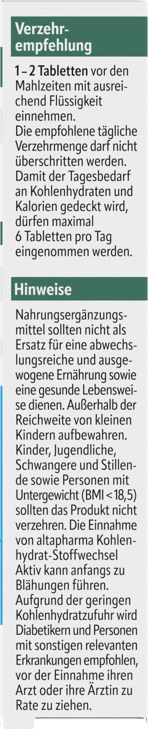 Kosttilskud bør ikke tjene som erstatning for en varieret og afbalanceret kost såvel som en sund livsstil. Den daglige dosis bør ikke overskrides. Kinder, unge, gravide og ammende kvinder samt personer, der er undervægtige (BMI 18.5) bør ikke forbruge produktet. Indtagelse af altapharma Carbohydrate Stofskifte Active kan initialt føre til flatulens. På grund af det lave kulhydratindtag anbefales diabetikere og personer med andre relevante sygdomme at konsultere deres læge, før de tager det.