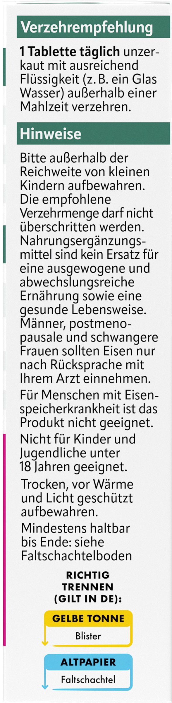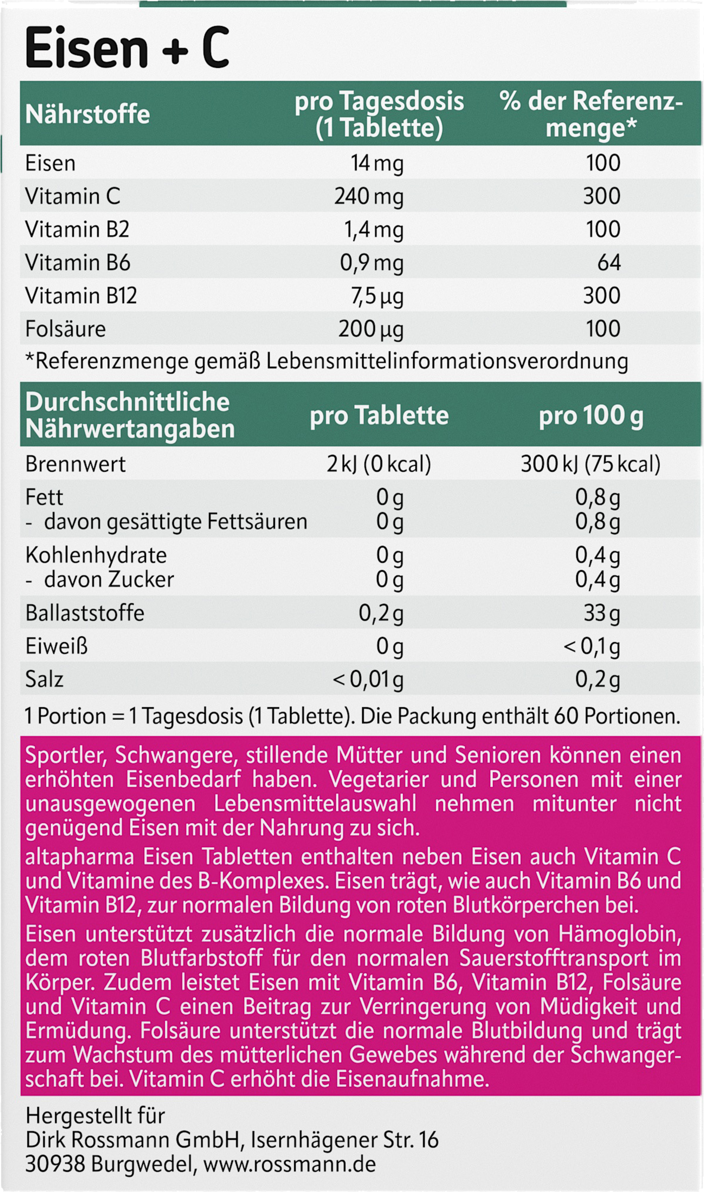 Sportsudøvere, gravide kvinder, ammende mødre og ældre kan have et øget behov for jern. Vegetarer og folk med en ubalanceret kostplan får sommetider ikke tilstrækkelig med jern i deres kost. Ud over jern indeholder jerntabletter fra altapharma også C- og B-kompleksets vitaminer, som er vigtige for jern- og blodstofskiftet. Jern er involveret i den normale dannelse af røde blodlegemer og dermed transport af ilt i blodet. Dermed kan jern også bidrage til at reducere træthed og udmattelse. Den spiller også en rolle for celledelingen. C-vitamin øger jernoptagelsen. B6- og B12-vitamin og folsyre bidrager til den normale dannelse af røde blodlegemer. B2-vitamin understøtter også jernstofskiftet og bidrager sammen med jern, B6-, B12- og C-vitamin til at reducere træthed og udmattelse og dermed til at understøtte ydeevnen.