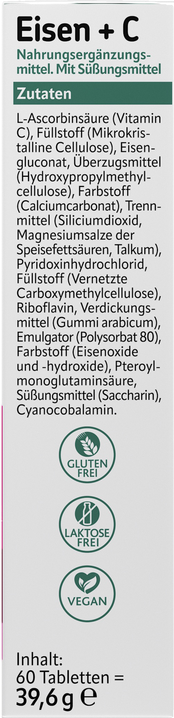 Ascorbinsyre (C-vitamin), Fyldstoffer (cellulose, tværbunden carboxymethylcellulose), Ferrogluconat, Pyridoxinhydrochlorid, Antiklumpningsmiddel (magnesiumsalte af fedtsyrer, talkum), Overtræksmiddel (hydroxypropylmethylcellulose), Emulgator (polysorbat 80), Farvestoffer (titandioxid, Jernoxider og jernhydroxider), Sukker,, Riboflavin, Pteroylmonoglutaminsyre, Cyanocobalamin.