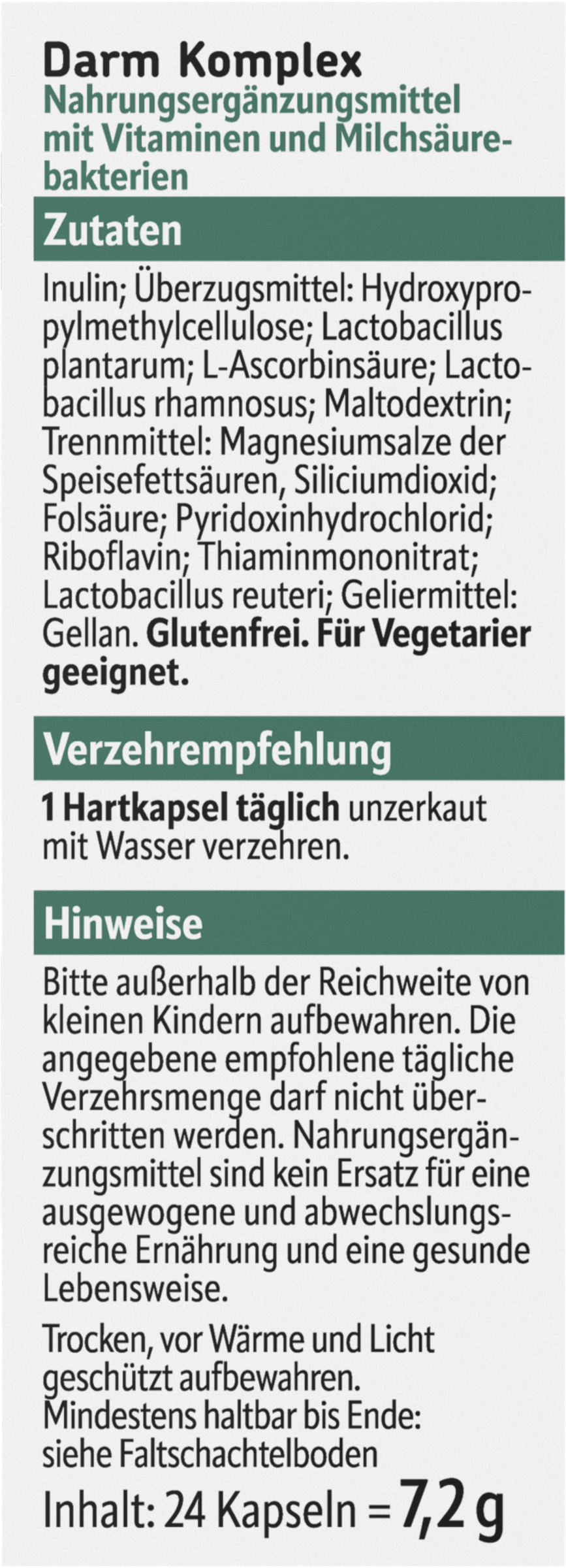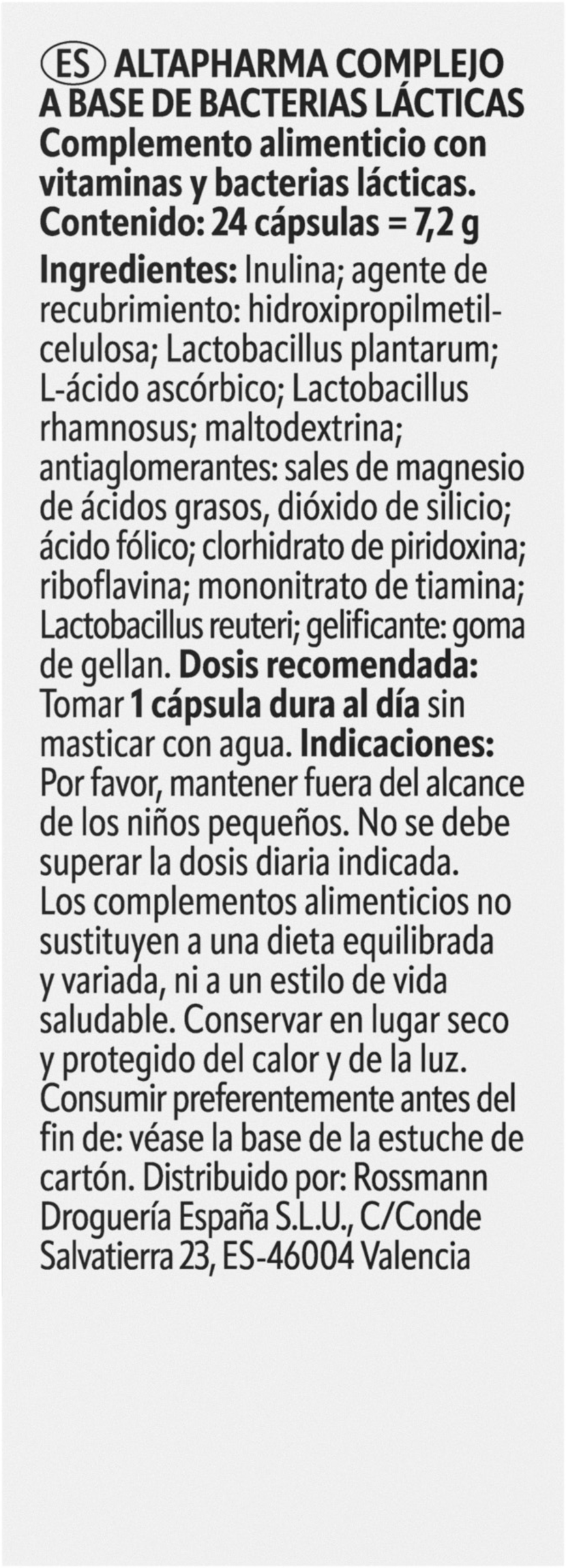 Stivelse; Lactobacillus rhamnosus; Inulin; Overfladebehandlingsmiddel: Hydroxypropylmethylcellulose; ascorbinsyre; Lactobacillus plantarum; antiklumpningsmiddel: Magnesiumsalte af fedtsyrer; pyridoxinhydrochlorid; riboflavin; thiaminmononitrat; Lactobacillus reuteri; folsyre