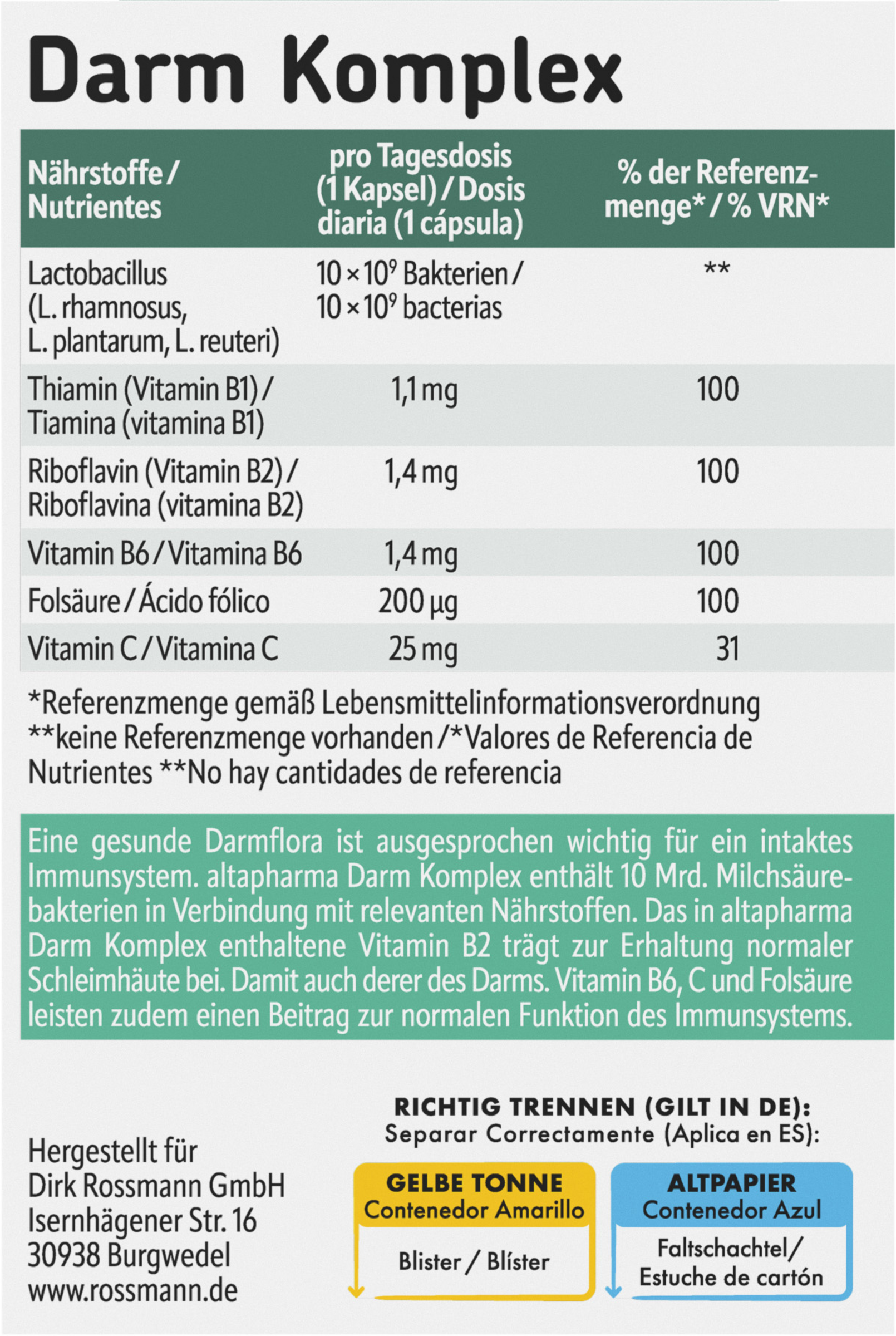 En sund tarmflora er yderst vigtig for et intakt immunsystem. altapharma Tarmkomplekskapsler indeholder 10 milliarder mælkesyrebakterier i kombination med relevante næringsstoffer. De indeholder riboflavin, også kendt som B2-vitamin, der bidrager til opretholdelsen af normale slimhinder. Inklusive dem i tarmen. B6-vitamin, C-vitamin og folsyre bidrager også til en normal funktion af immunsystemet.
