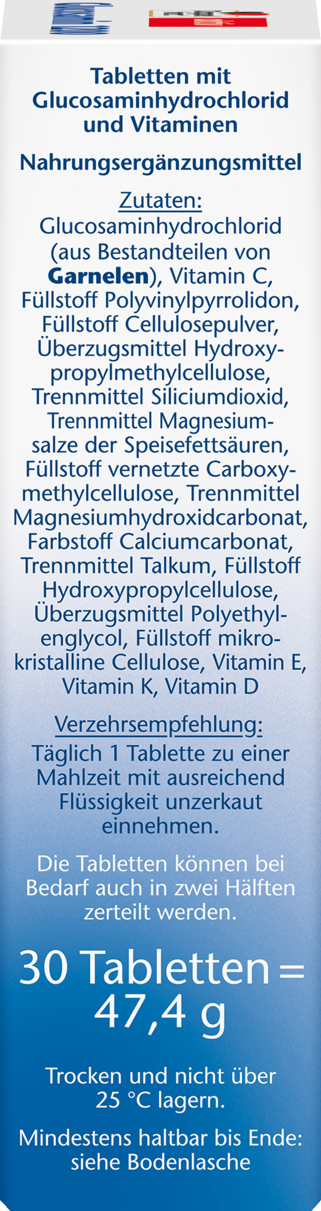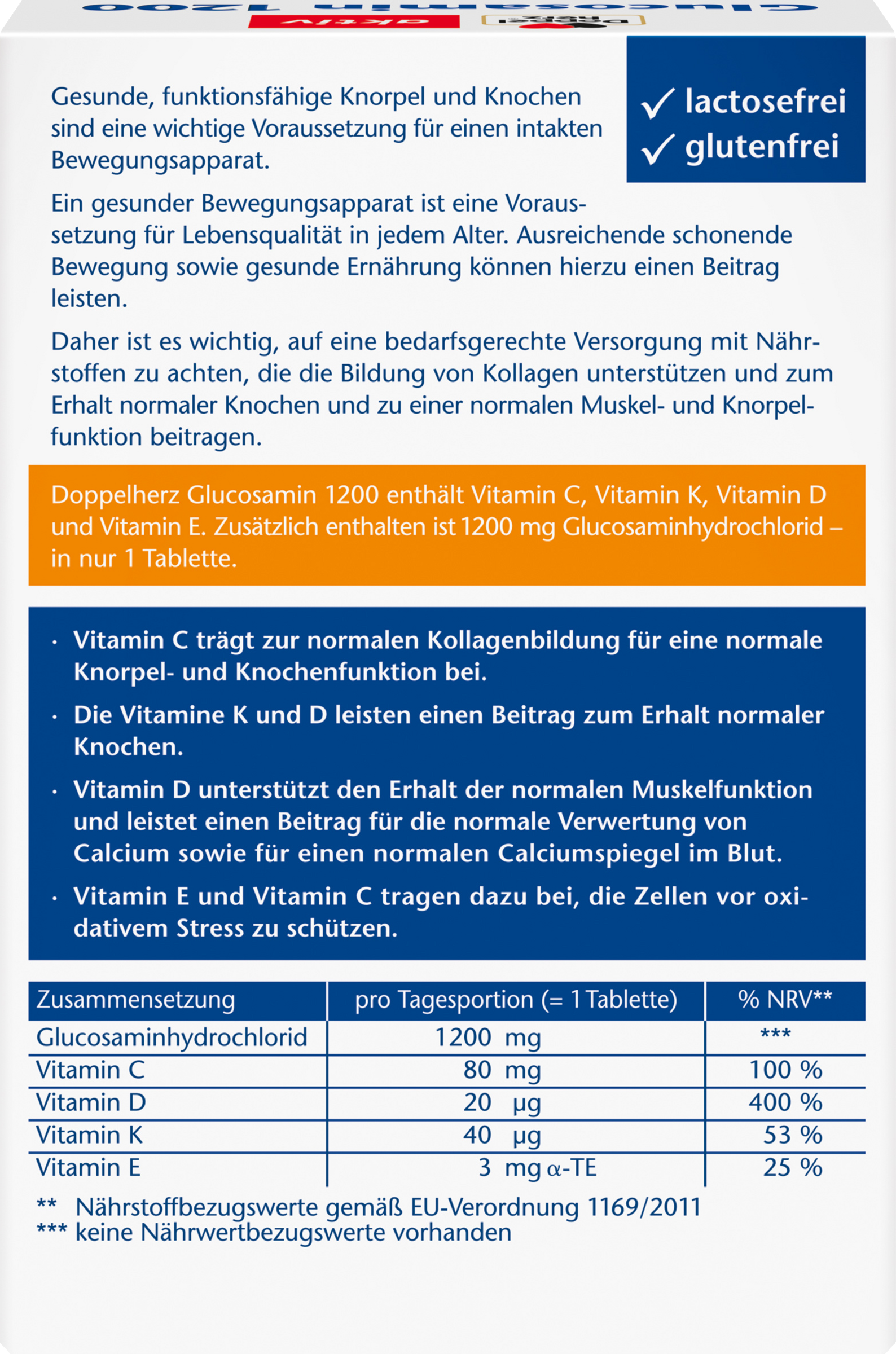 Doppelherz Glucosamine 1200 indeholder C-vitamin, E-vitamin, K-vitamin og D-vitamin. Den indeholder også 1200 mg glucosaminhydrochlorid - i kun 1 tablet.