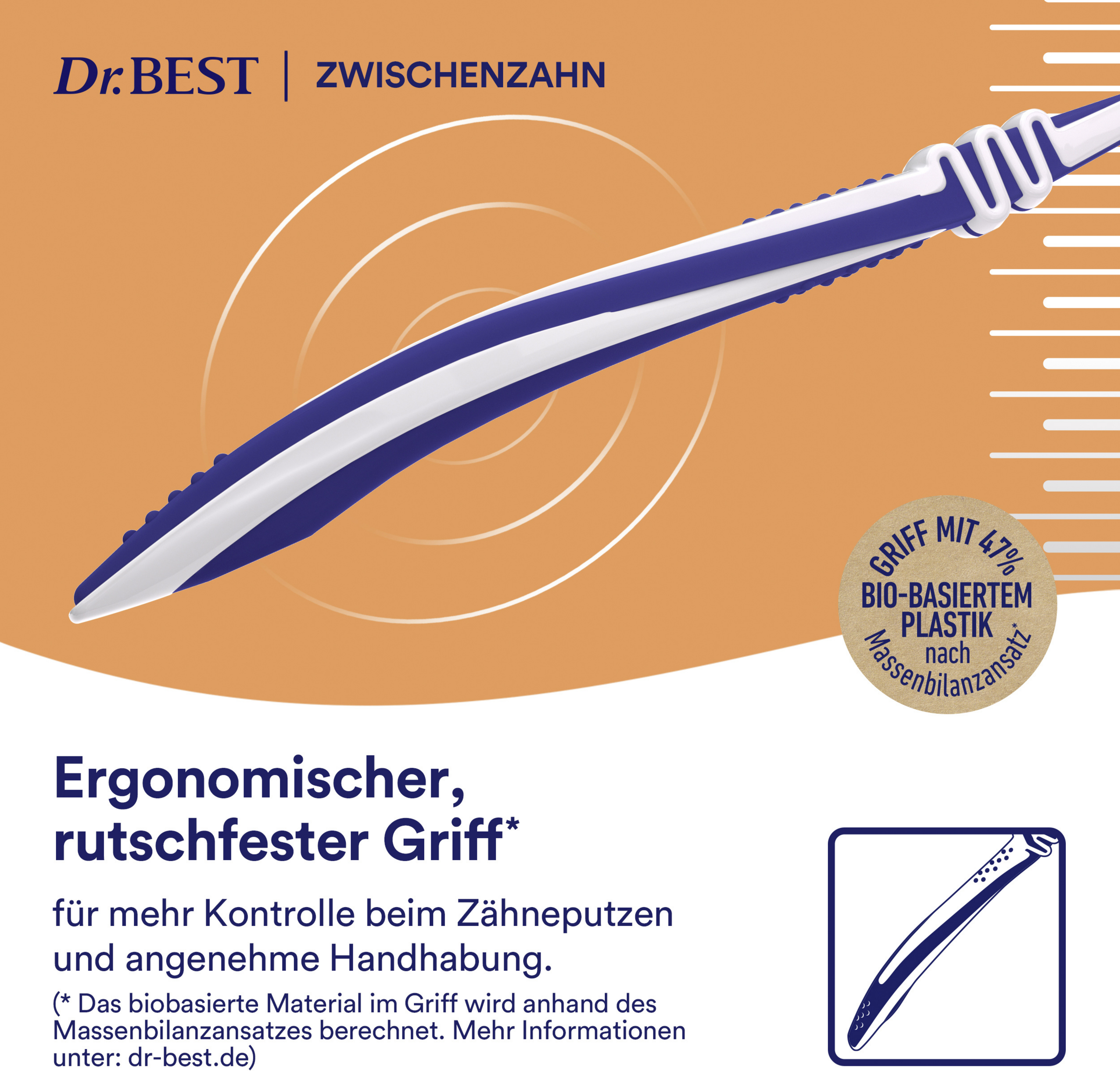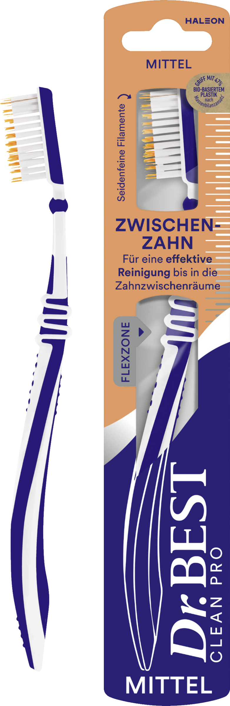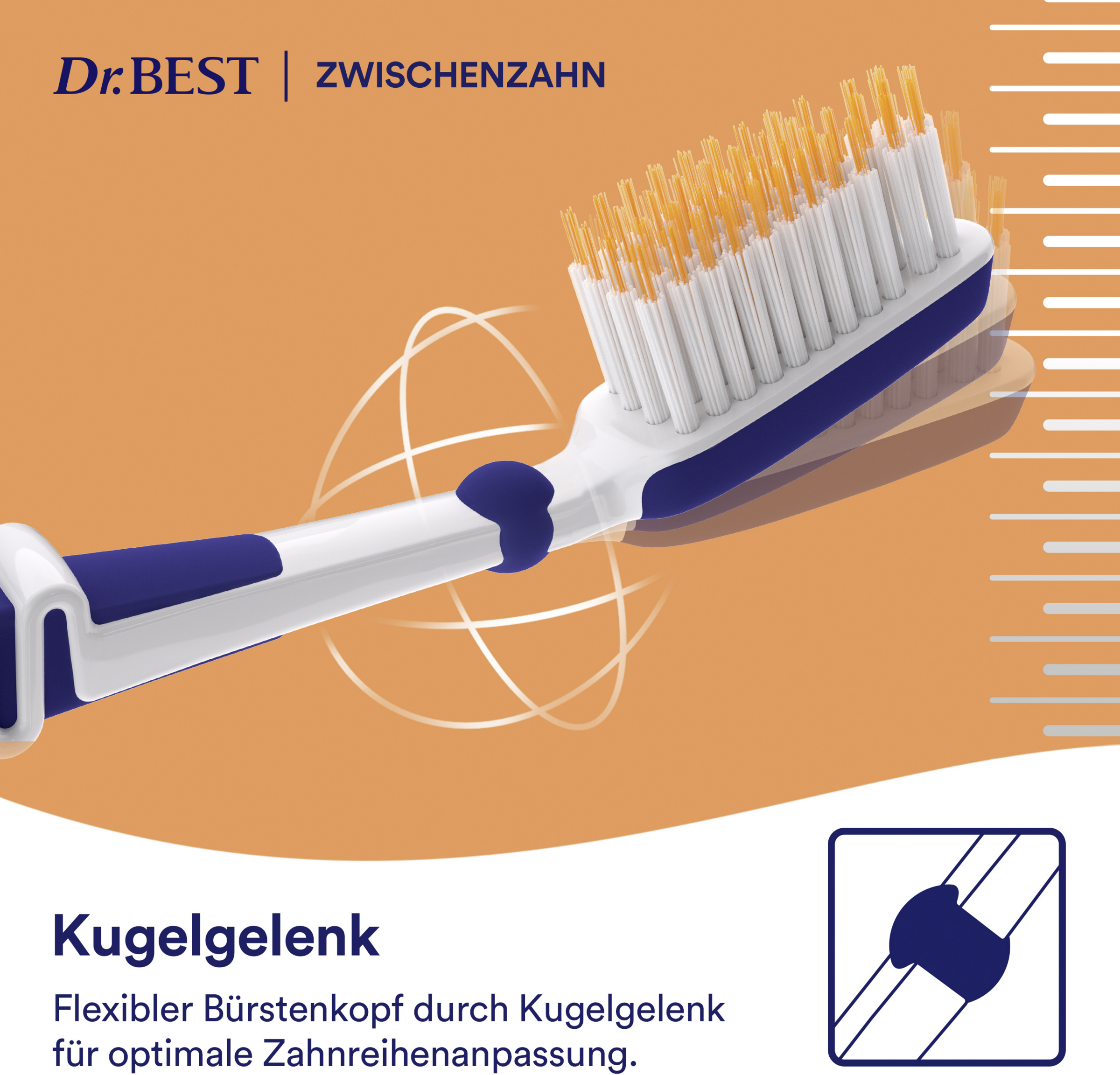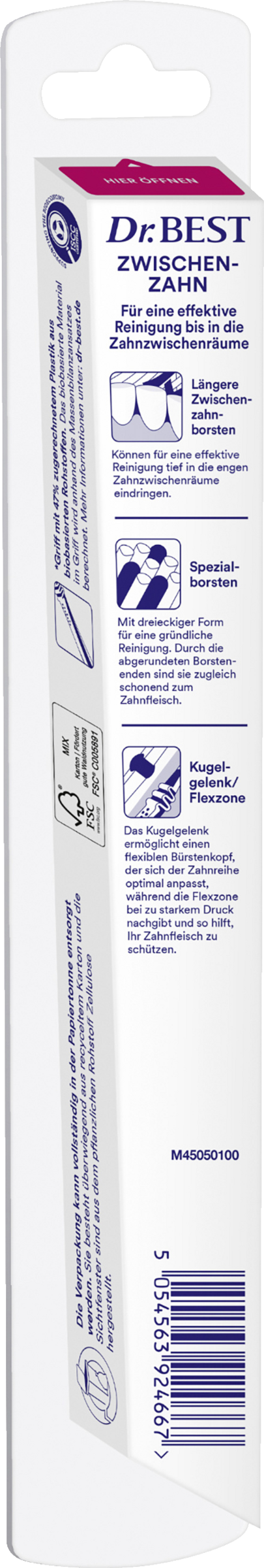 Bakterier samler sig i mellemrummet mellem tænderne og er ganske svære at fjerne. Konventionelle tandbørster med et jævnt børstehårsfelt kan ikke nå tilstrækkeligt langt ind i mellemrummet mellem tænderne - ophobningen af plak mellem tænderne kan være resultatet. Dr.BEST Zwischenzahn er inspireret af tandtråd**. Dens længere spiralbørstehår rager ud over børstehårsfeltet. På den måde kan de trænge dybt ind i mellemrummet mellem tænderne. Det drejelige hoved med kugleled bidrager desuden til en god rengøring, da børstehovedet kan tilpasses tænderne. Du nyder naturligvis også godt af Dr.BEST Zwischenzahn ved en skånsom rengøring af tandkødet takket være den gennemprøvede Dr.BEST-specialaffjedring. Den giver efter for et for hårdt tryk ved tandbørstningen og medvirker således til at beskytte tandkødet mod skader.
