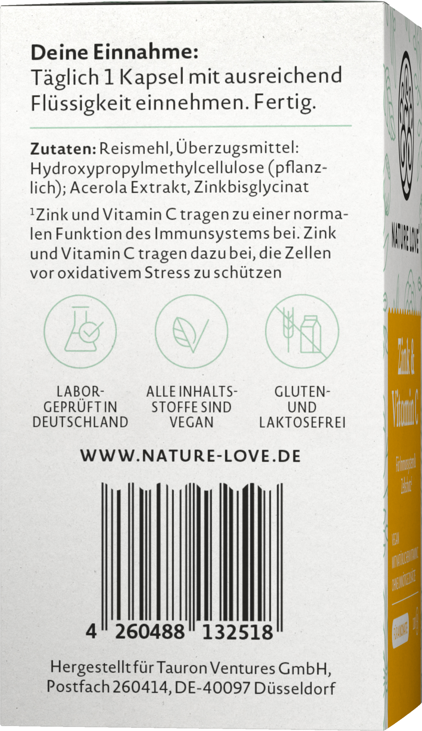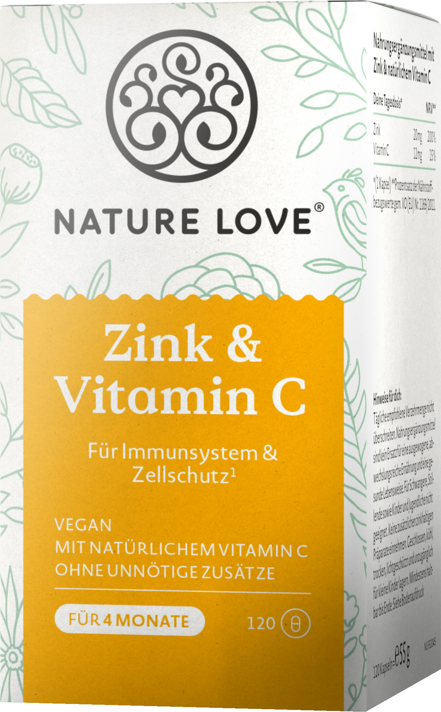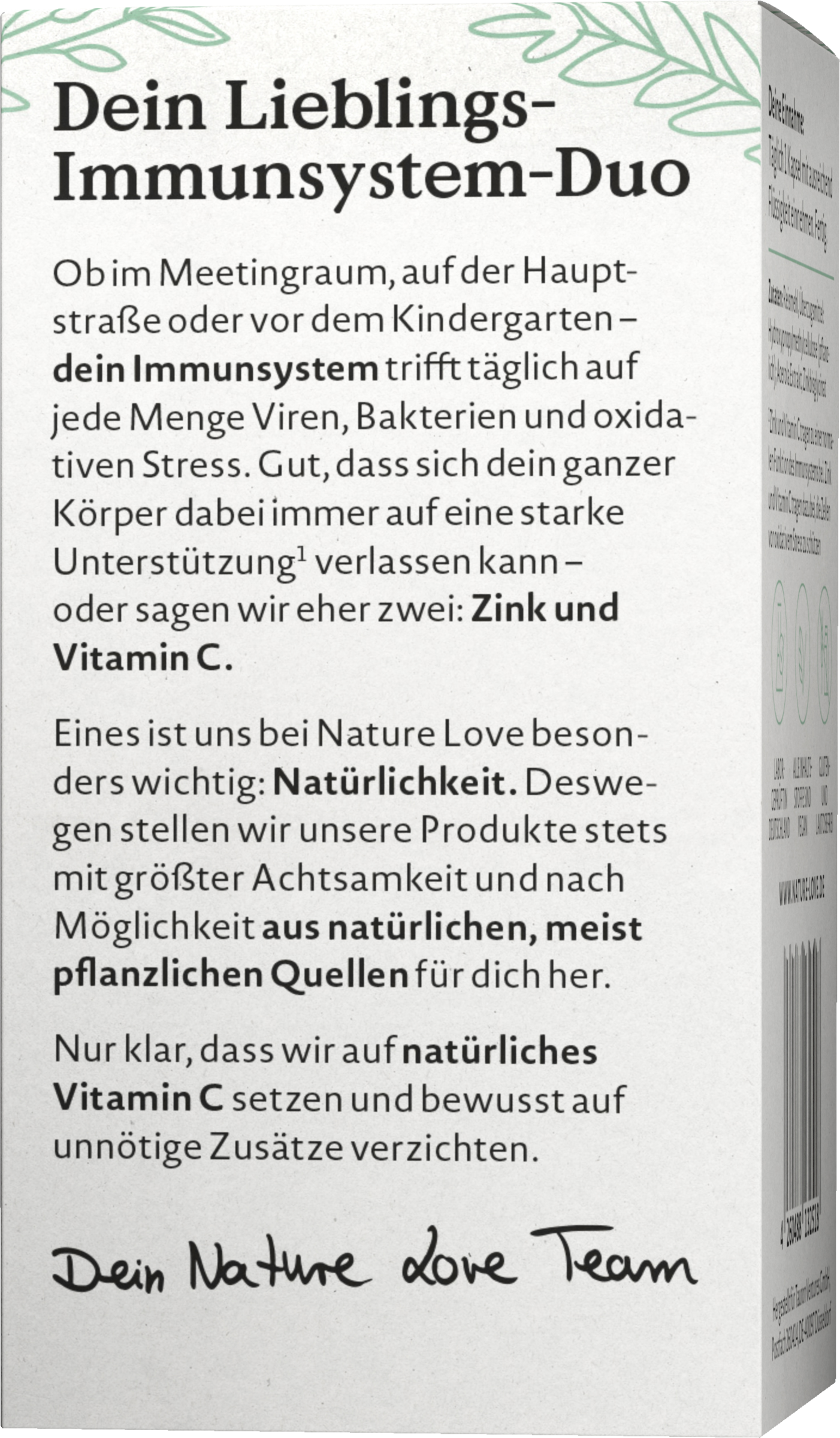 Uanset om det er i mødelokalet, på hovedgaden eller uden for børnehaven - dit immunsystem møder masser af vira, bakterier og oxidativ stress hver dag. Det er godt, at hele din krop altid kan stole på en stærk støtte* - eller rettere to: Zink og C-vitamin. Det er kun naturligt, at Love Nature satser på naturligt C-vitamin fra acerolakirsebærret og bevidst undgår unødvendige tilsætningsstoffer. En ting er særlig vigtig for Love Nature: Naturlighed. Derfor fremstiller de deres produkter til dig med den største omhu og så vidt muligt fra naturlige, rent plantebaserede kilder.