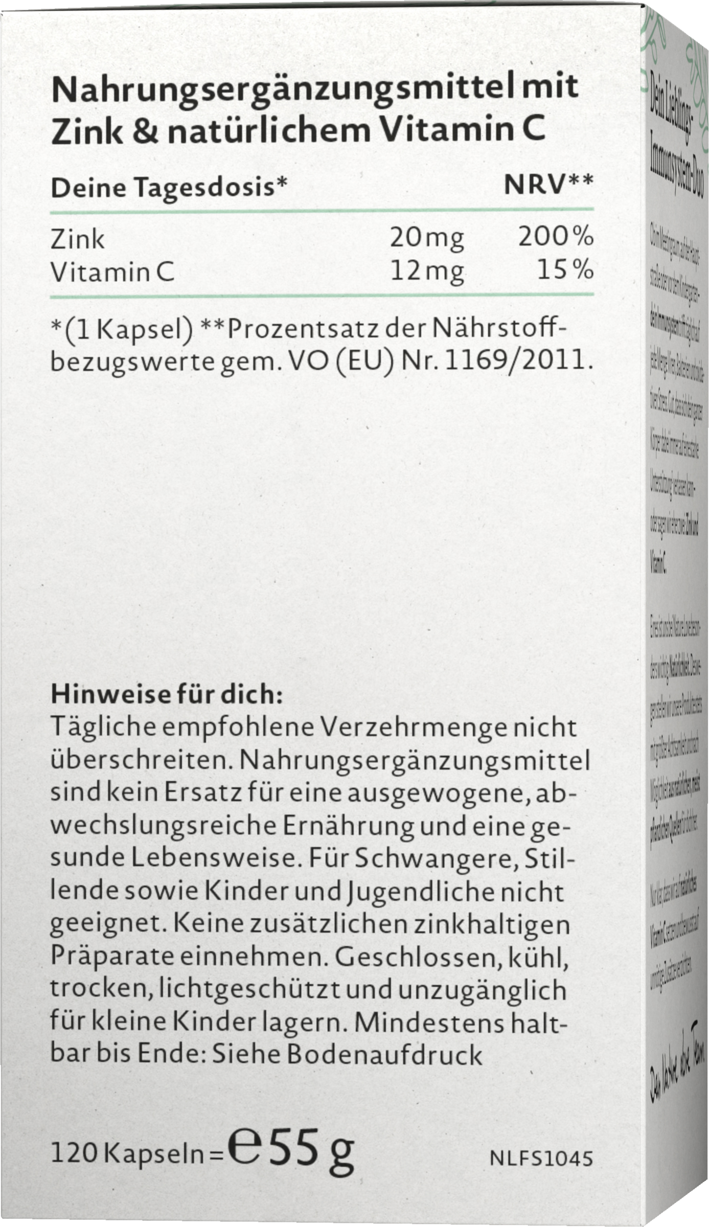 *Zink og C-vitamin bidrager til immunsystemets normale funktion og til at beskytte cellerne mod oxidativt stress. Zink bidrager til at vedligeholde normal hud og hår.