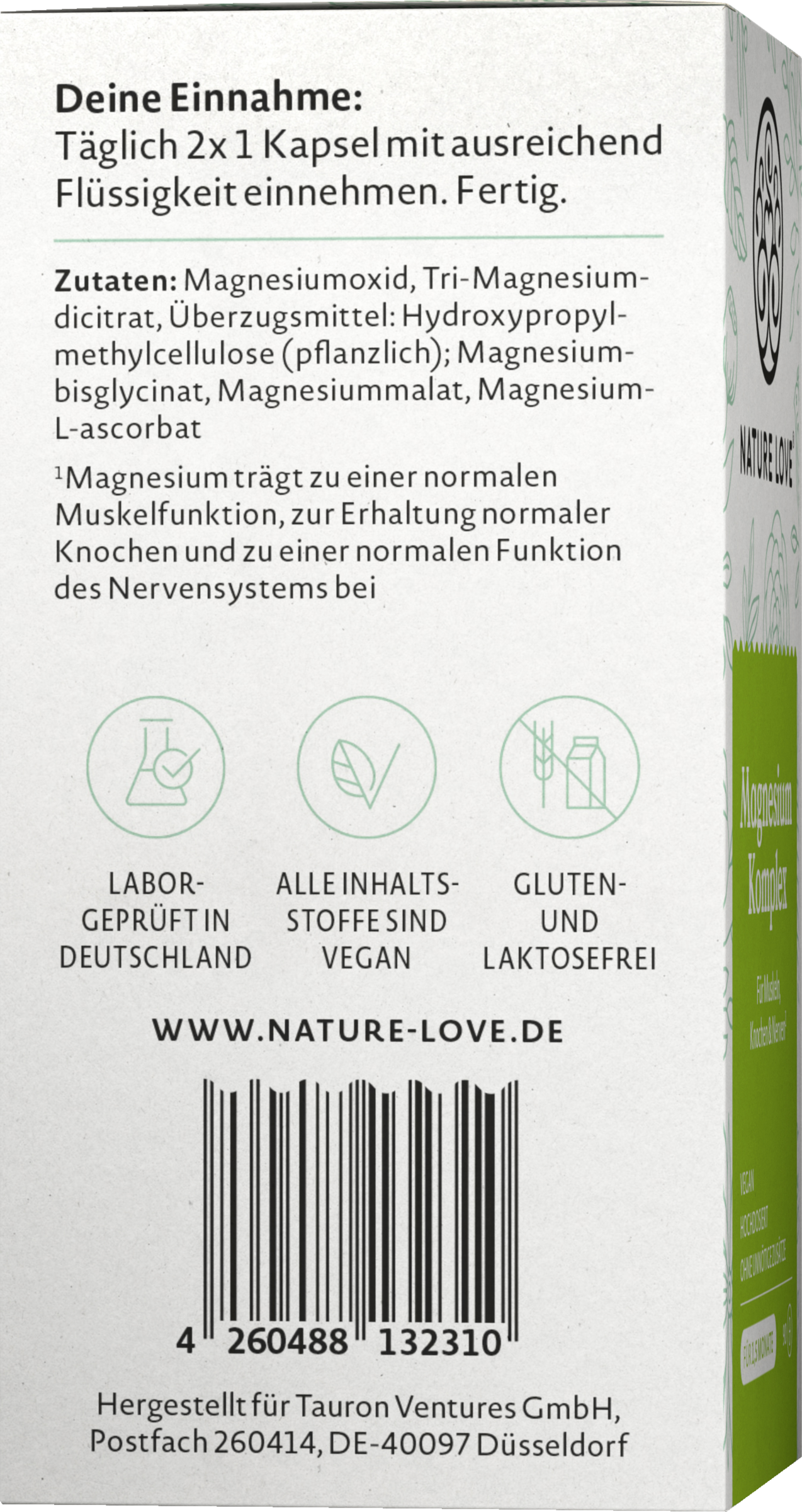Uanset om det er vægttræning eller mental træning - din krop klarer en lang række udfordringer hver dag og er glad for at modtage støtte, der er lige så alsidig: vores magnesium-kompleks. Den ideelle formel til kortvarig absorption og langvarig depoteffekt. Så muskler, knogler og hoved kan klare alle toppræstationer - og så du kan slappe af bagefter* Love Nature Magnesium Complex indeholder ingen unødvendige tilsætningsstoffer. En ting er særlig vigtig for Love Nature: Naturlighed. Derfor fremstiller de deres produkter til dig med den største omhu og så vidt muligt fra naturlige, rent plantebaserede kilder.