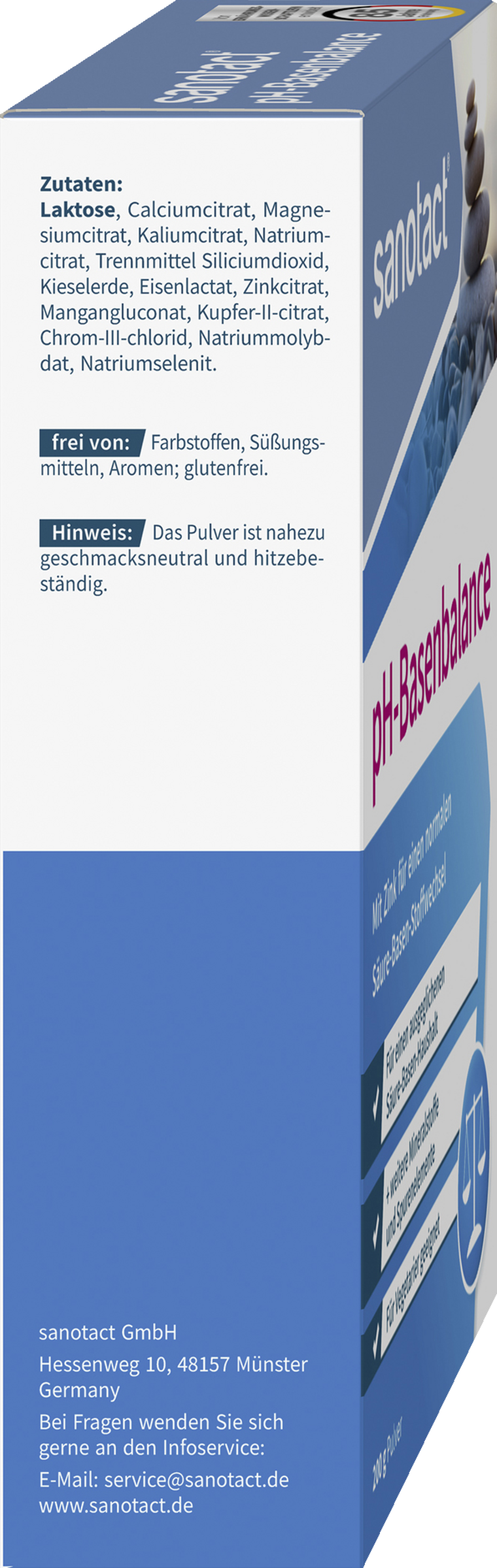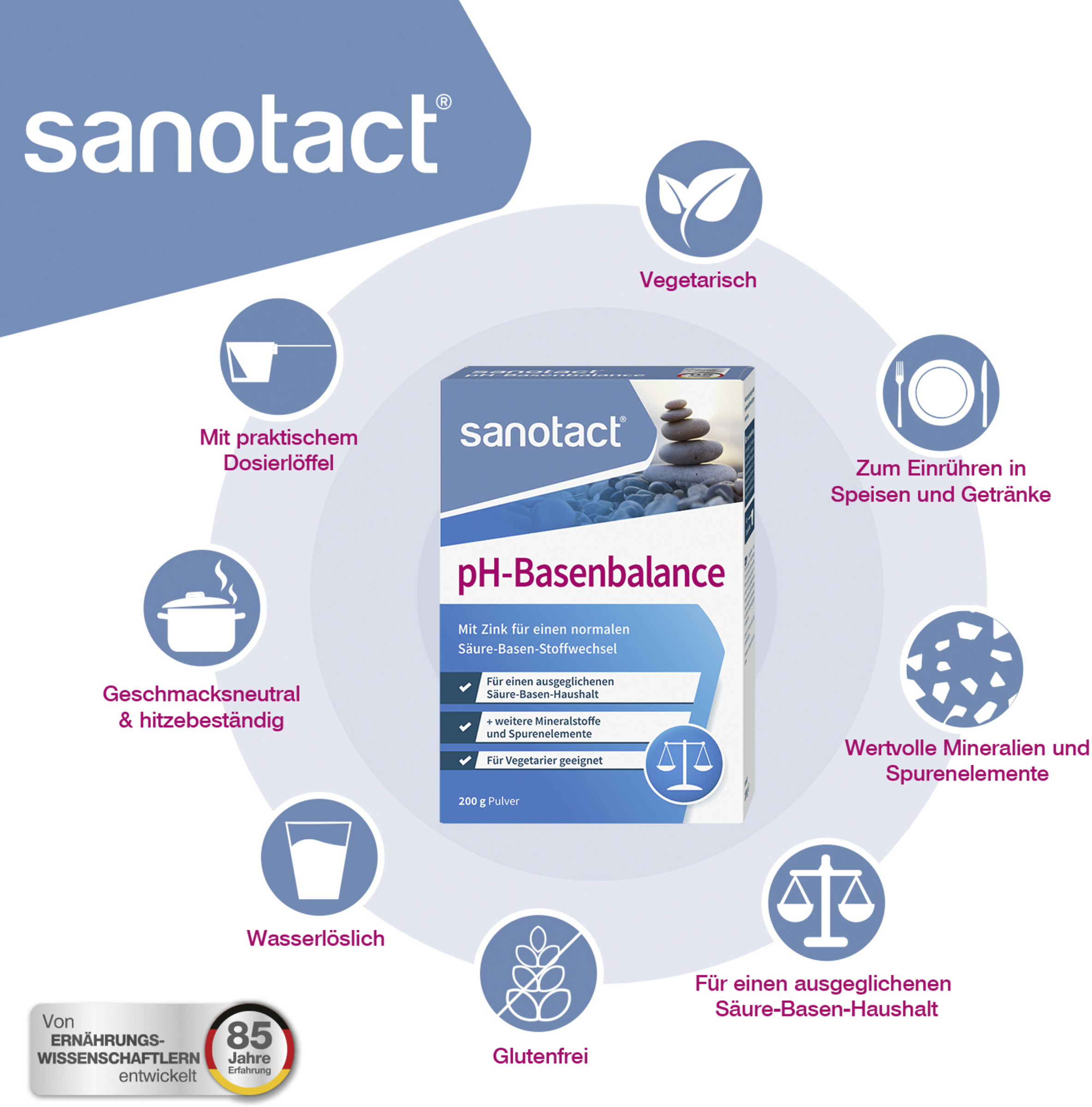 Ved at tage sanotact® pH-base balance, kan vi forsyne vores Krop med de essentielle Mineraler og sporstoffer, den har brug for for at opretholde et afbalanceret syre-base Stofskifte og understøtte vores fysiske velvære.