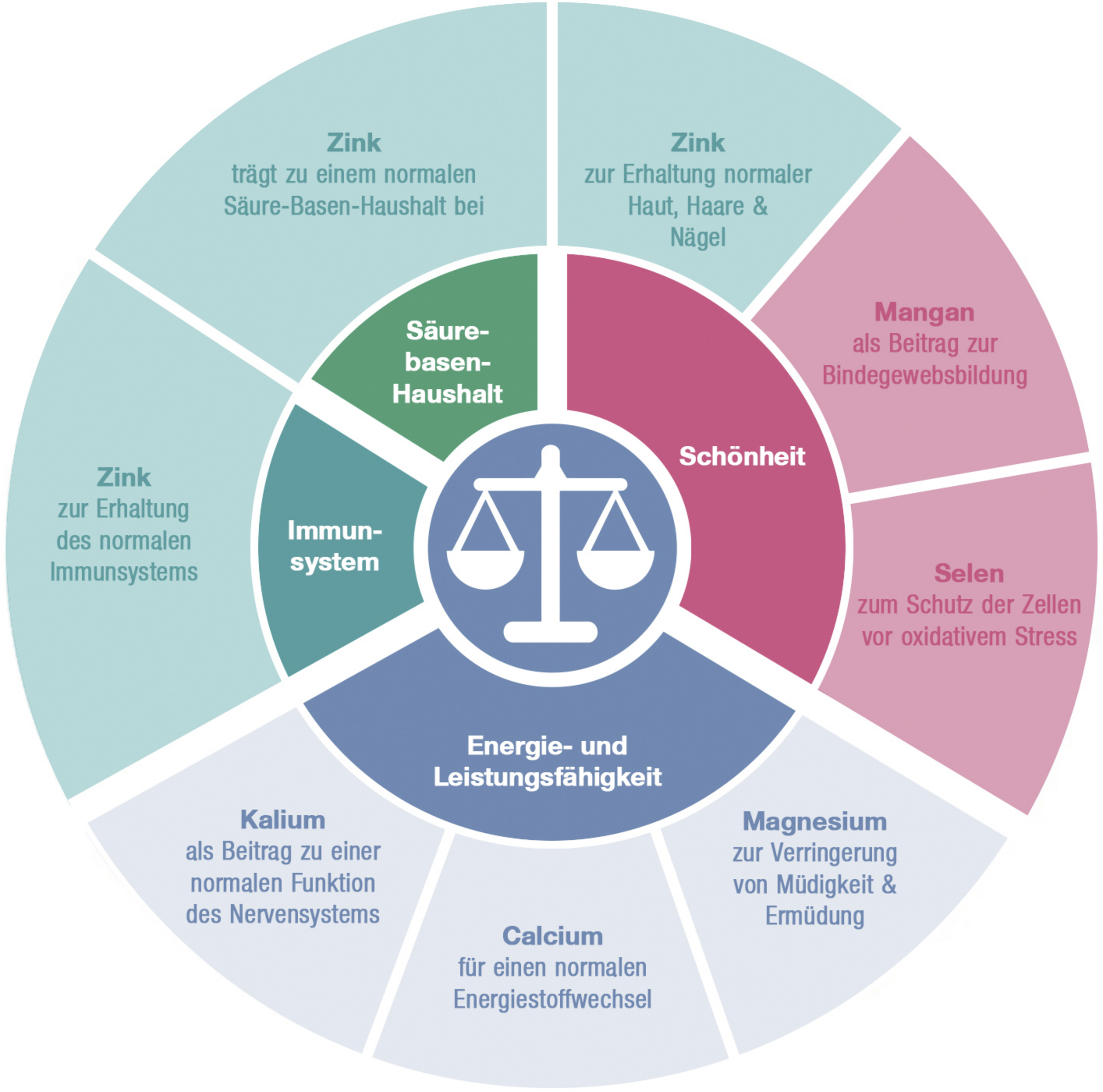 Zink bidrager til normal syre-base Stofskifte . Magnesium og jern bidrager til at reducere træthed og Calcium, mangan og kobber understøtter normalt Energistofskifte. Derudover hjælper Calcium med normal knoglevedligeholdelse, og mangan og kobber understøtter normal bindevævsdannelse.